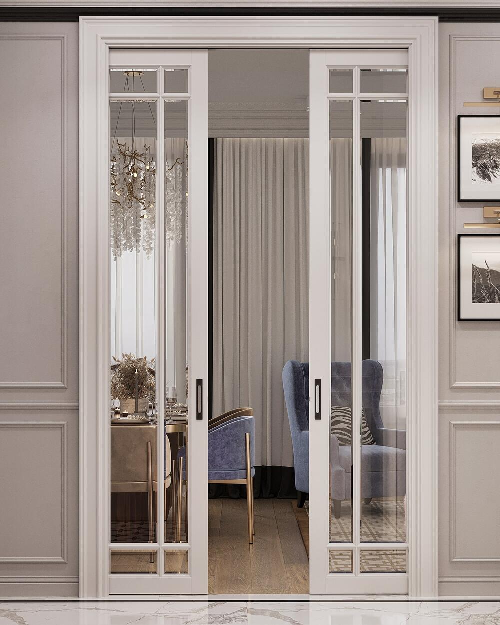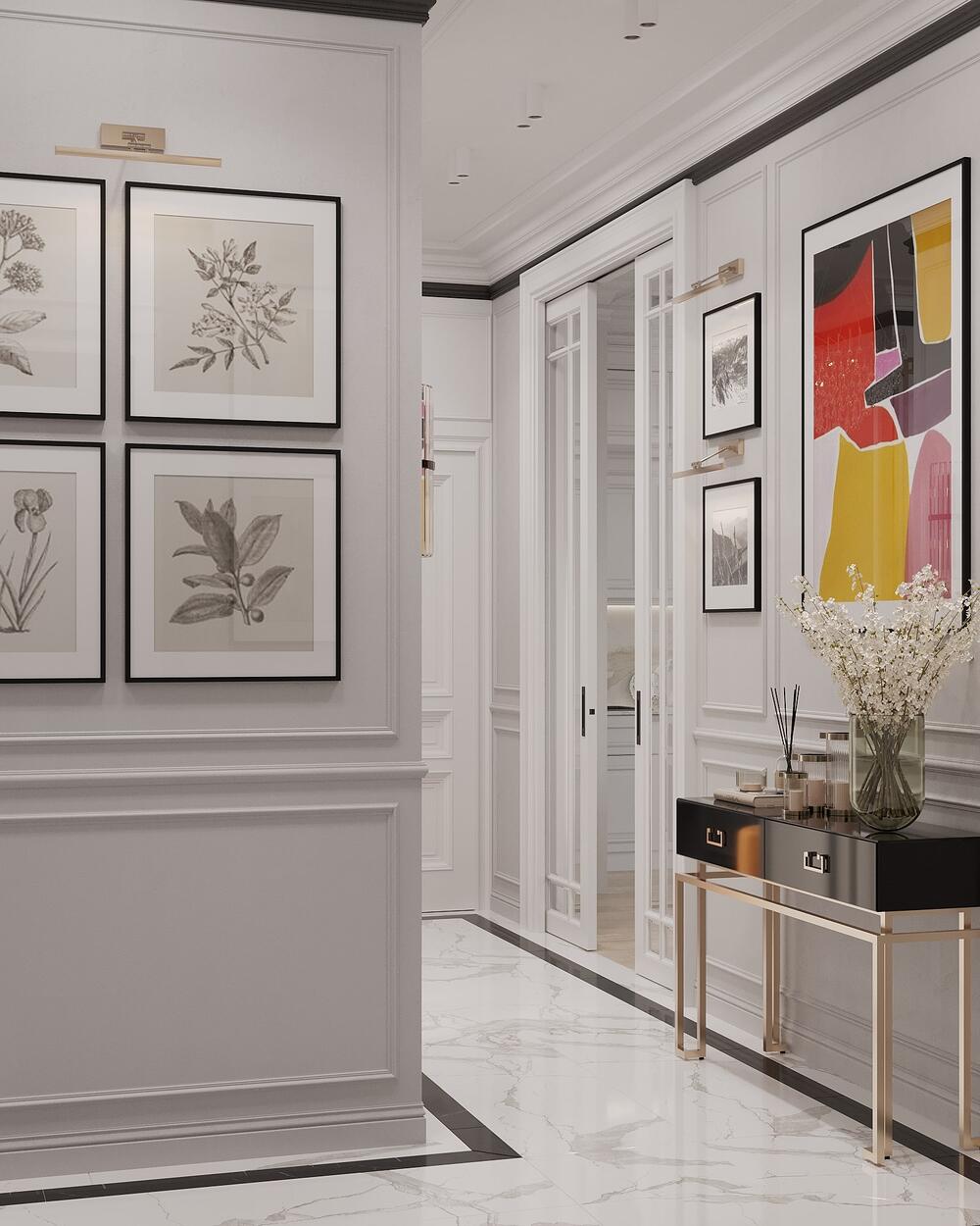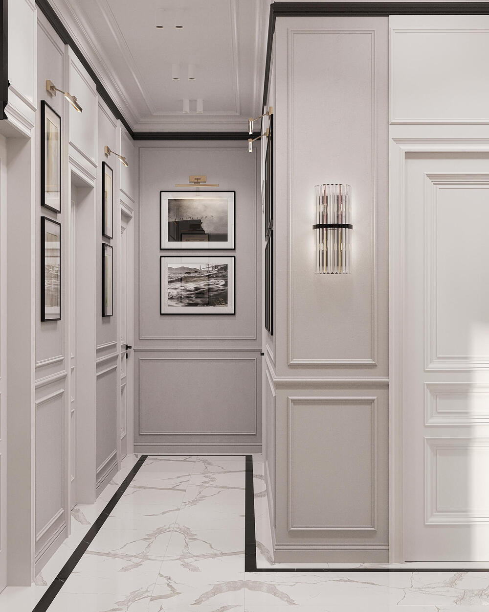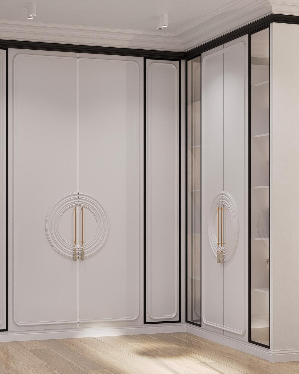 Интерьер выполнен в современном стиле с элементами неоклассики и арт-деко. Четкая симметрия, молдинги, декоративные панели и латунные акценты сочетаются с современной мебелью и встроенными системами хранения.