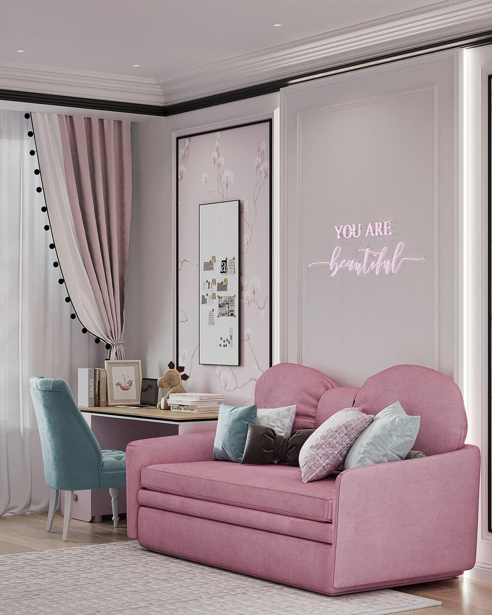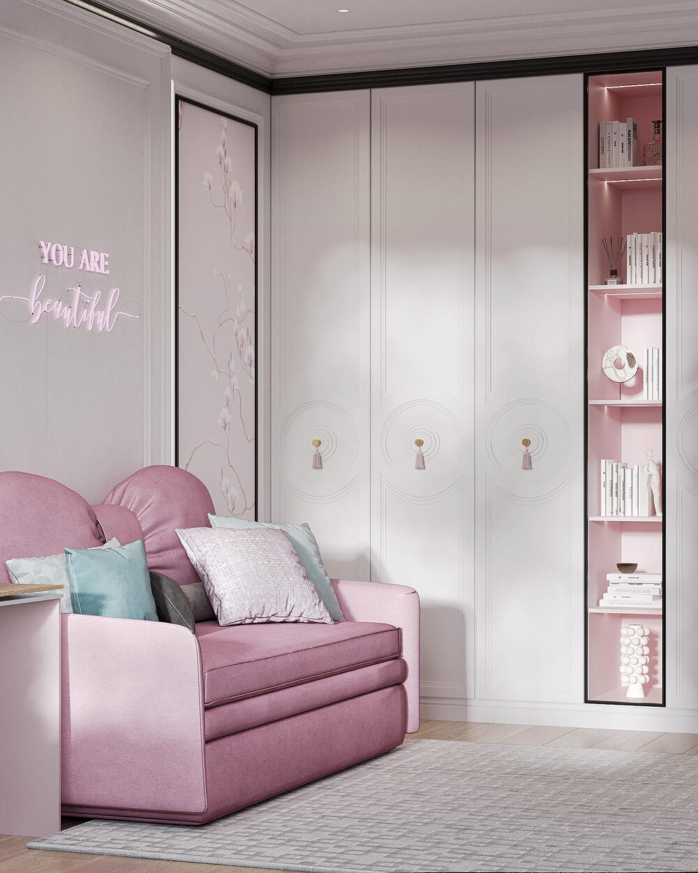 Комната предназначена для девочки 9 лет, поэтому здесь всё продумано под возраст и будущий рост. В интерьере сочетаются светлая база и мягкие акценты — комната выглядит свежо, но не перегруженно.