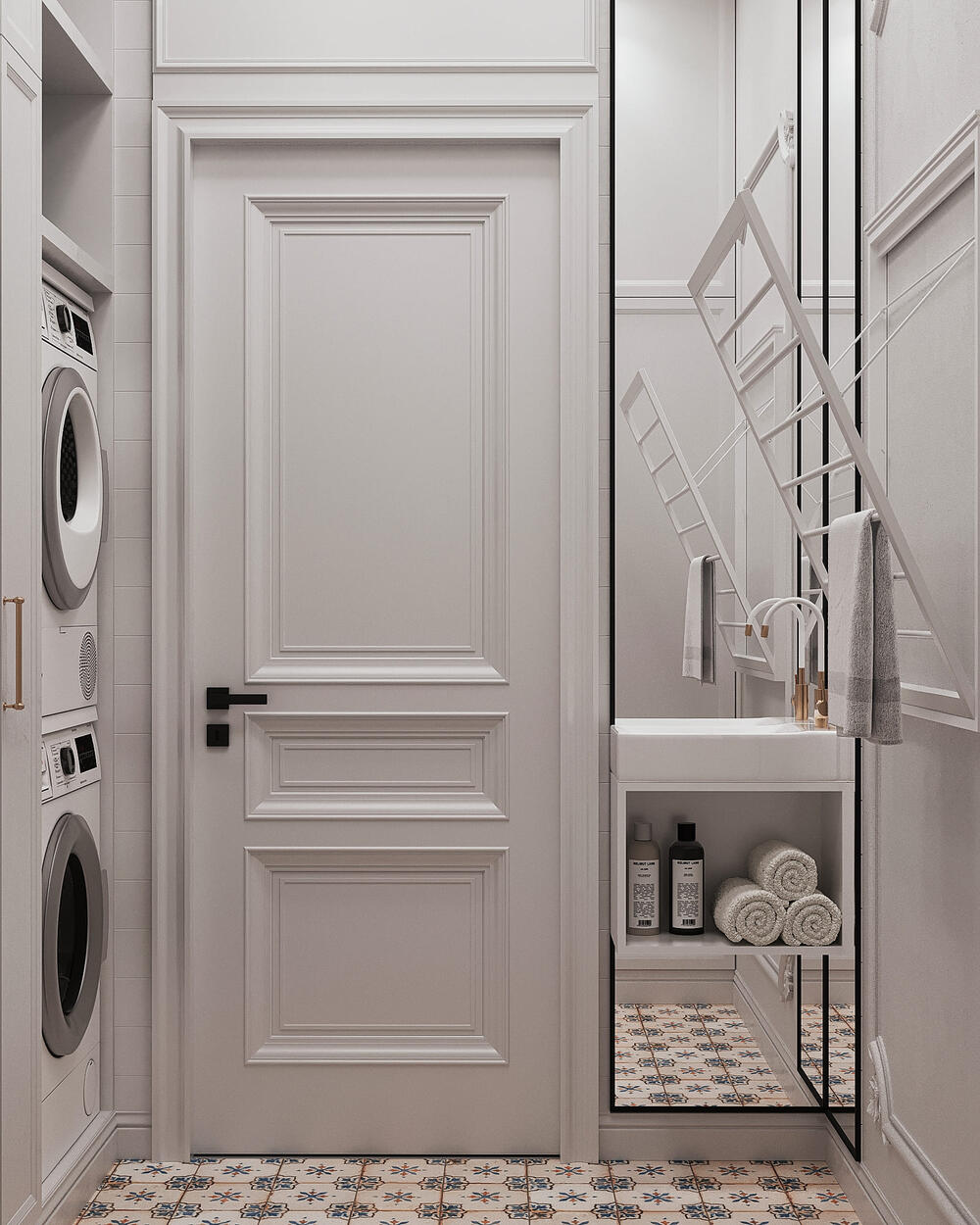 Постирочную организовали вместо третьего санузла — получилось полноценное отдельное помещение. Здесь разместили стиральную и сушильную машины в колонну, системы хранения для бытовой химии, белья и полотенец, а также компактную раковину с зеркалом.