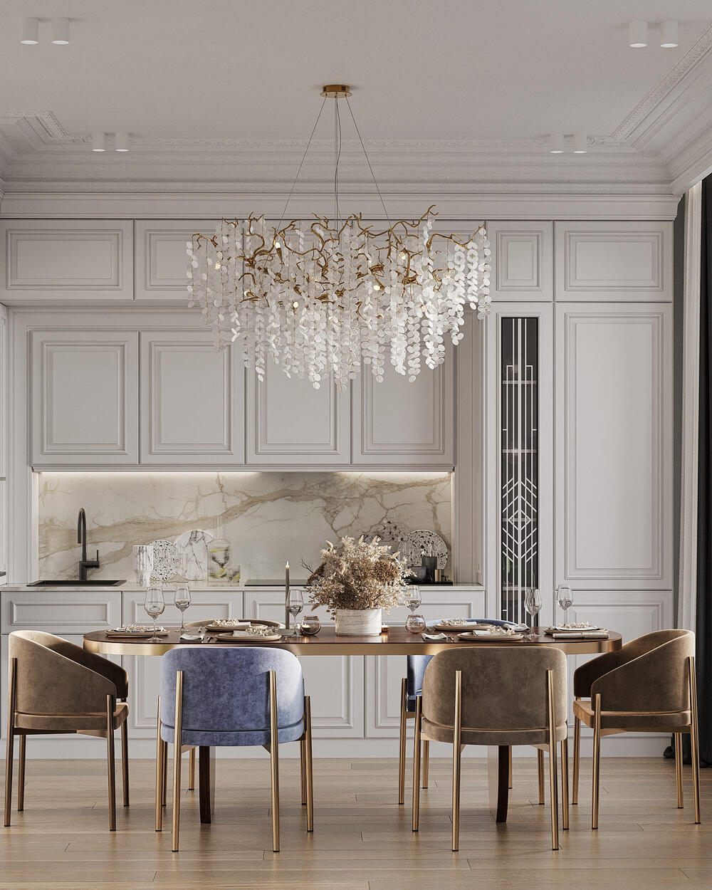 Кухню было решено делать без острова, чтобы полноценно разместить обеденный стол по центру комнаты. Благодаря этому приёму столовая зона стала центром композиции и визуальным акцентом.