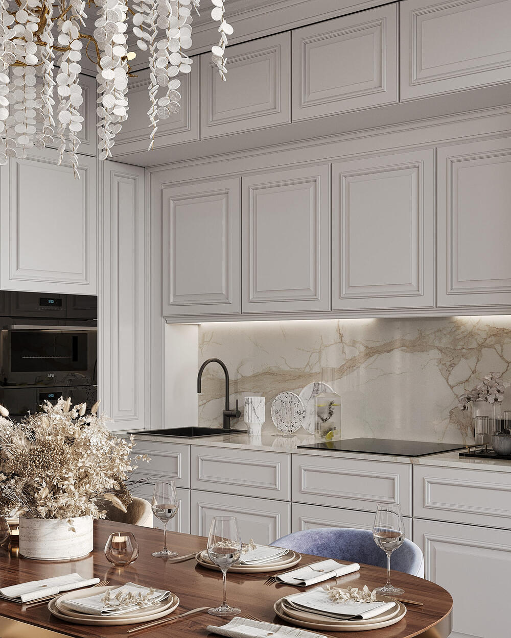 Планировка кухни — линейная, с функциональным встроенным блоком для духового шкафа и микроволновки. Основная рабочая зона организована вдоль одной стены: здесь размещены мойка, варочная поверхность, вытяжка, рабочие столешницы и вместительные шкафы. Фасады — с фрезеровкой, в классическом стиле, выполнены в светло-сером тоне. Акценты — чёрный смеситель, мраморный фартук с ярко выраженным рисунком, встроенная подсветка. Второй блок по перпендикулярной стене — это высокий модуль с бытовой техникой, визуально завершает композицию, не загромождает пространство.