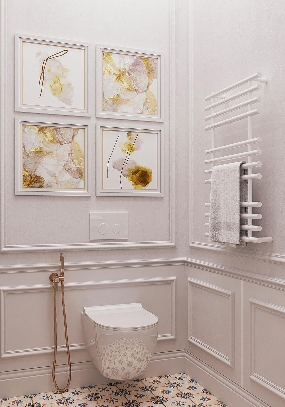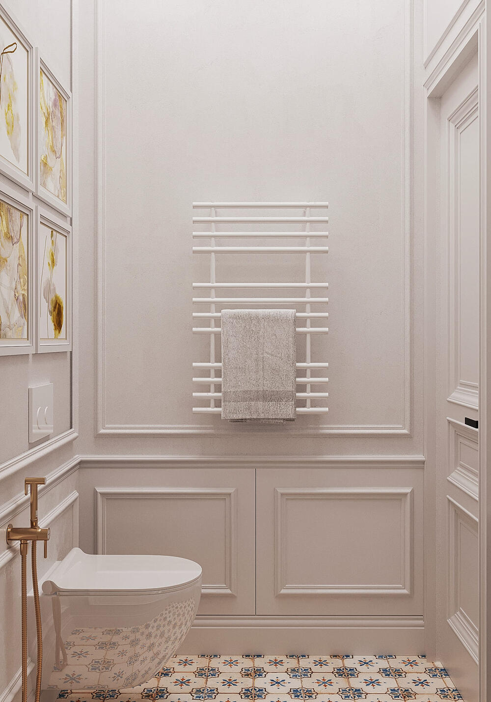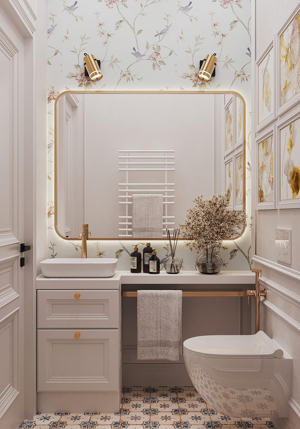 Гостевой санузел получился небольшим, но очень выразительным. На стенах — декоративные панели и светлые обои с цветочным рисунком, на полу — плитка с орнаментом. Всё выдержано в общей стилистике квартиры.