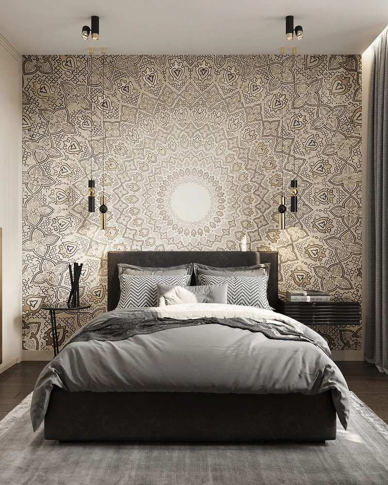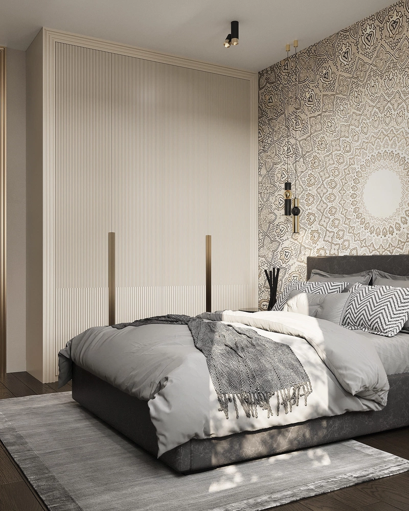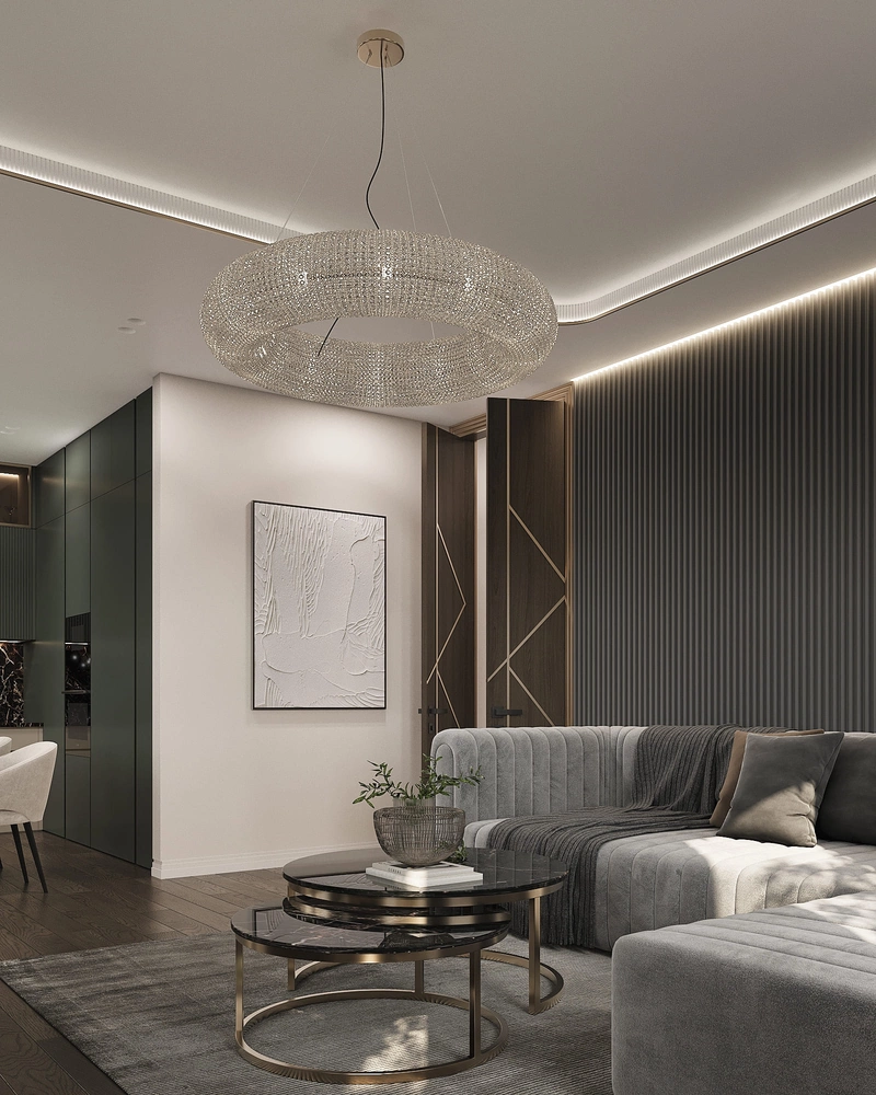 Стены украшены декоративными панелями с рельефной фактурой и встроенной подсветкой. Освещение построено по многослойному принципу: потолочная люстра, скрытая подсветка по периметру и настенные бра.