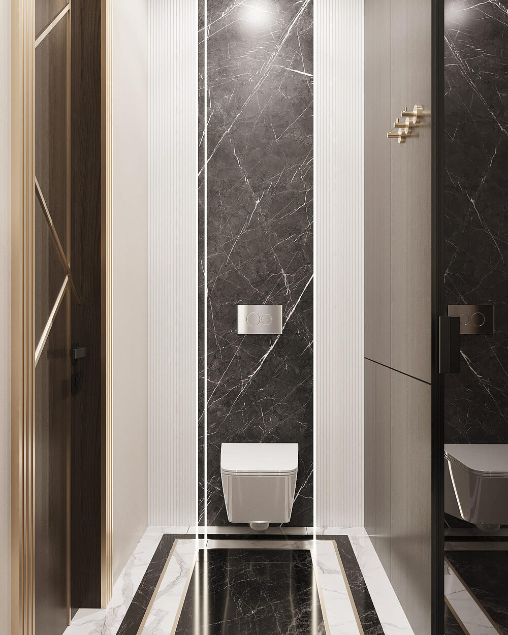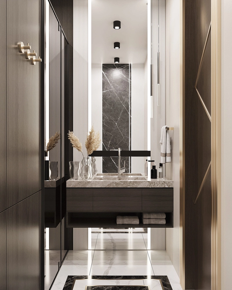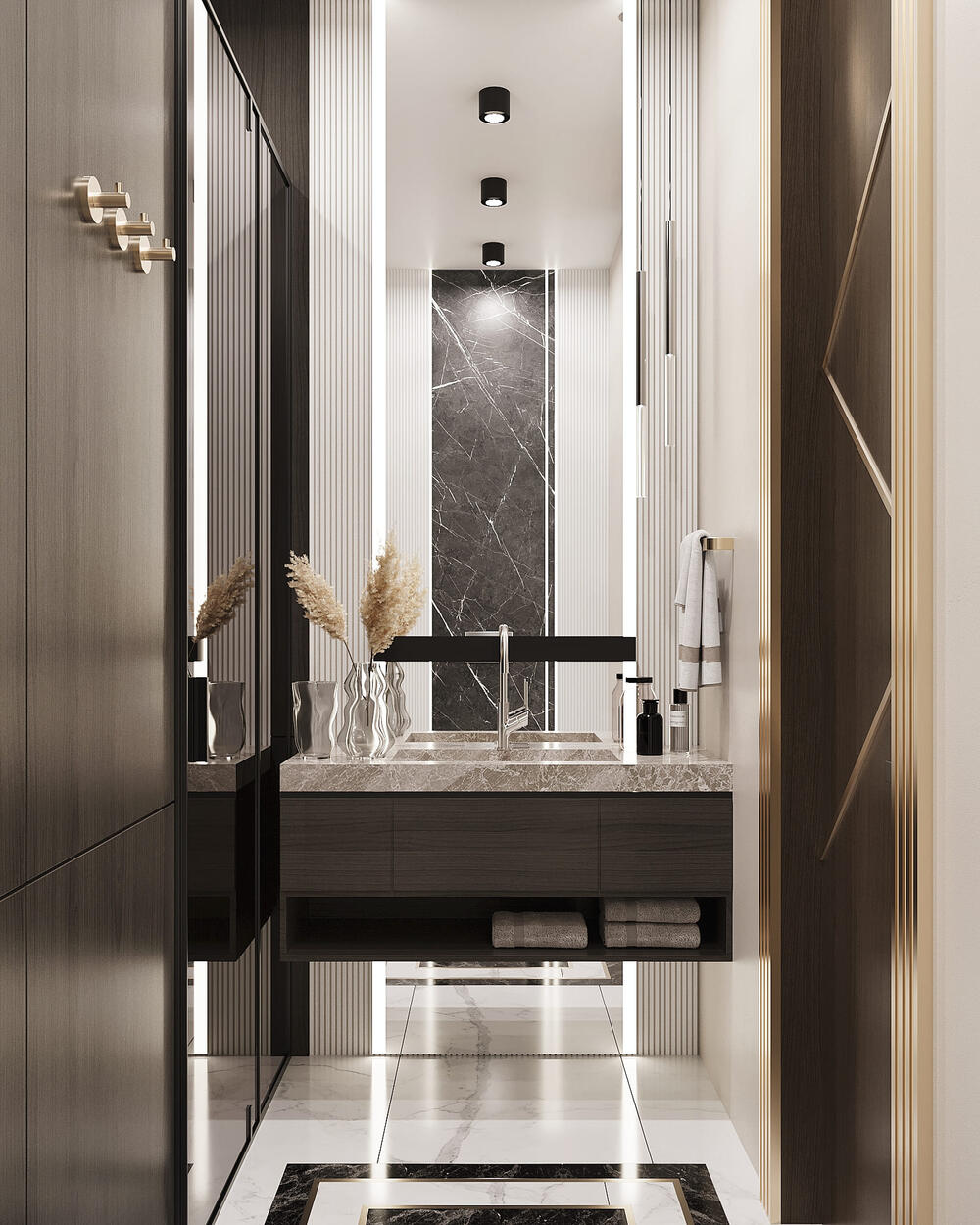 Ванная оформлена в тёмных оттенках с мрамором, шпоном ореха и золотыми деталями. Пространство продумано так, чтобы всё было под рукой. Широкая столешница удобно размещает косметику, а встроенные шкафы скрывают бытовые мелочи.