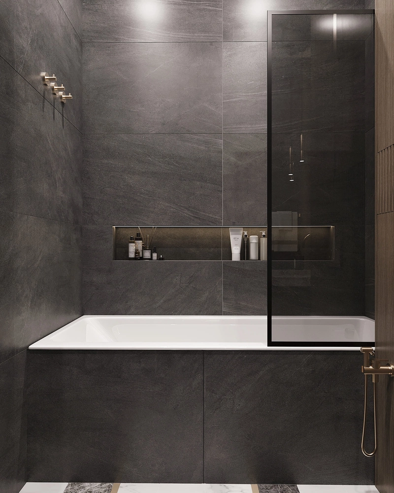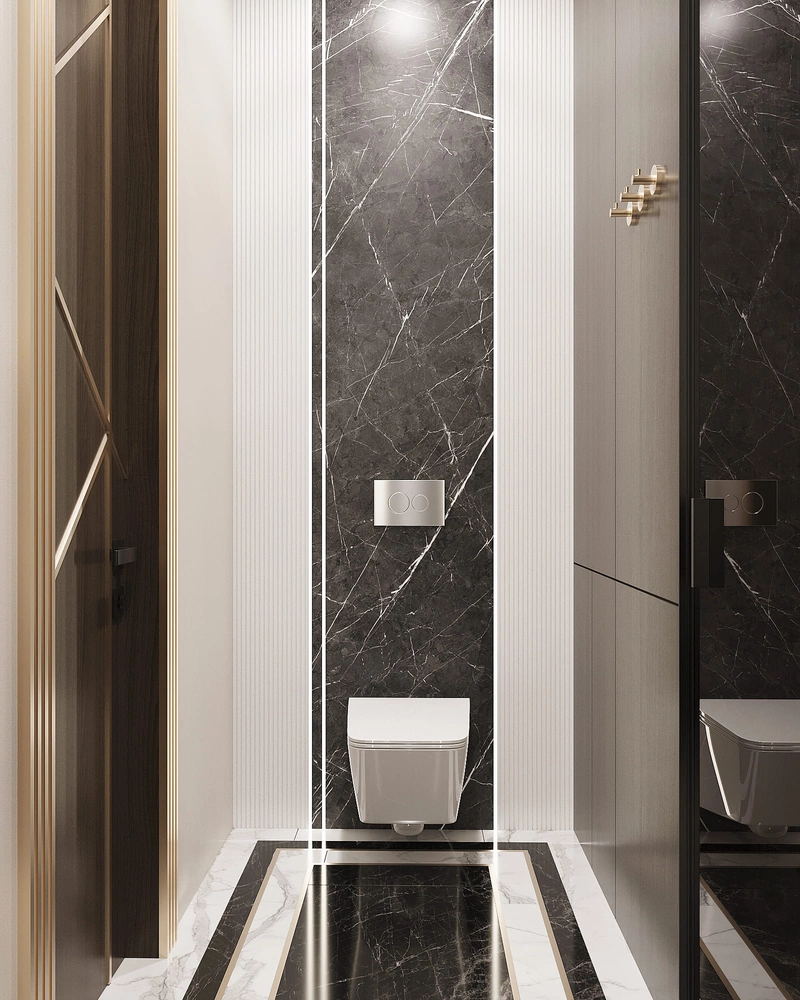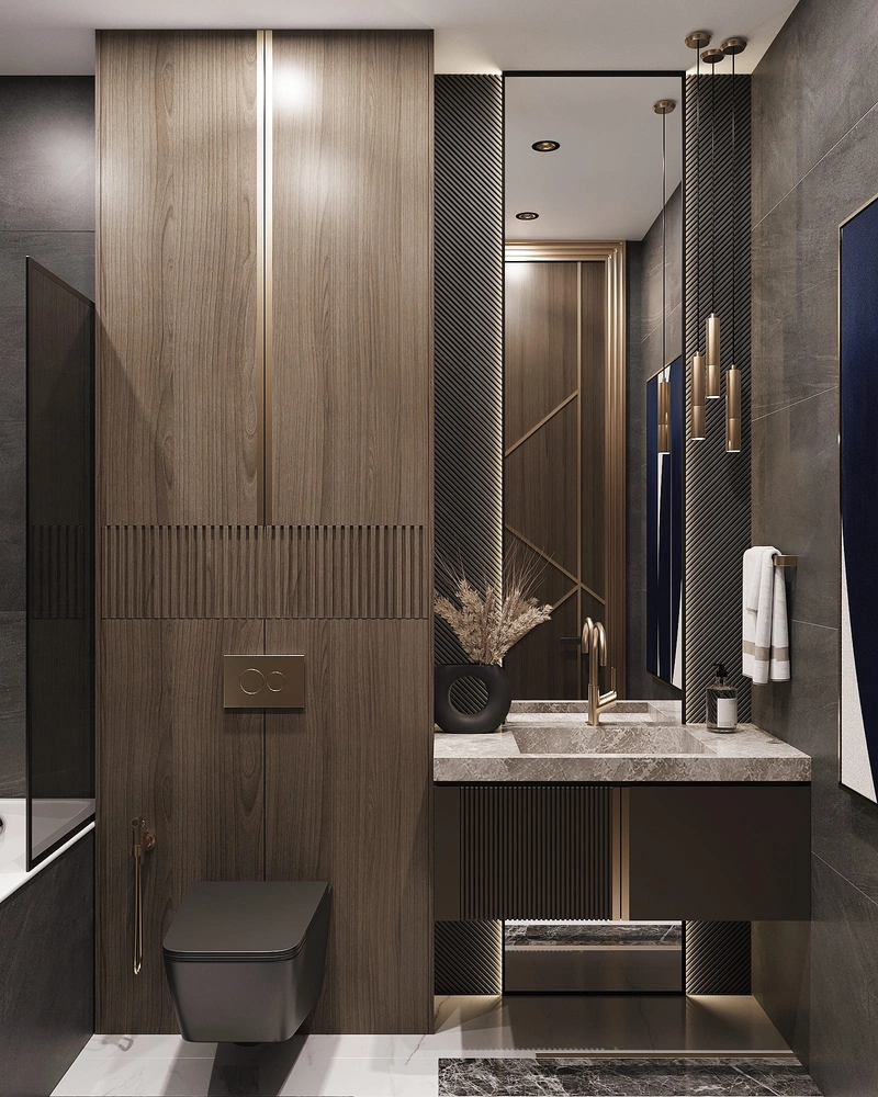 Компактный, но функциональный. Подвесная тумба с умывальником упрощает уборку. Душевая с прозрачными перегородками сохраняет ощущение простора. Декоративные панели на стенах добавляют глубины интерьеру.