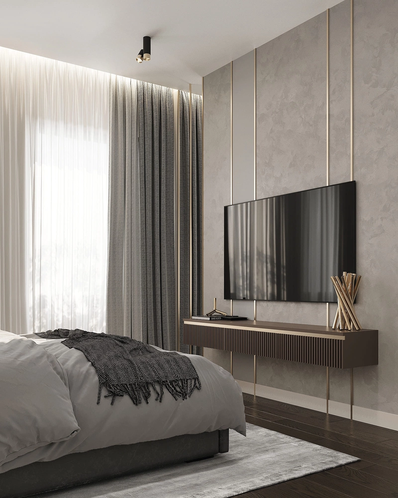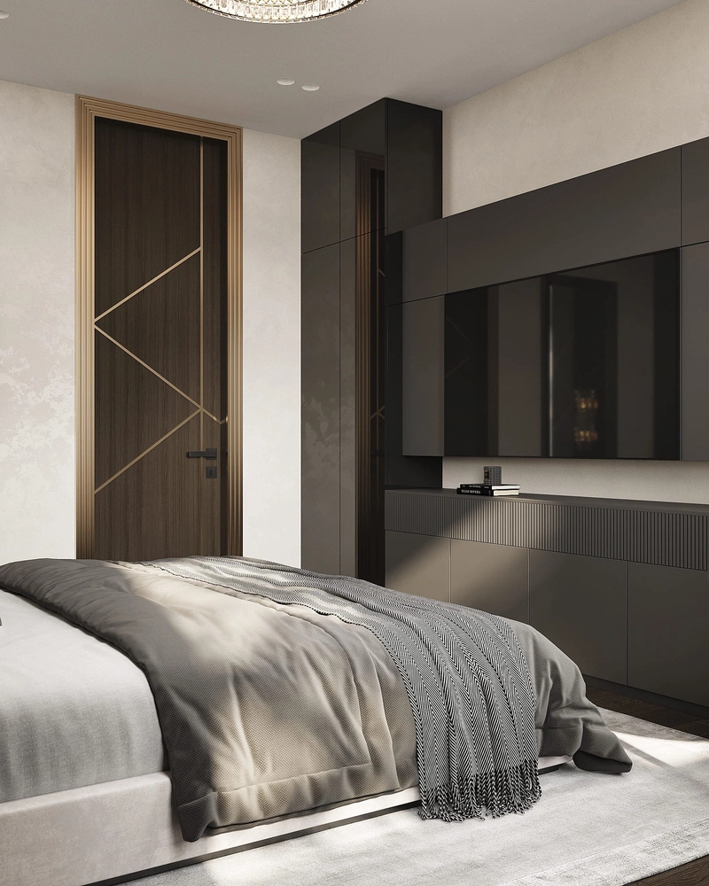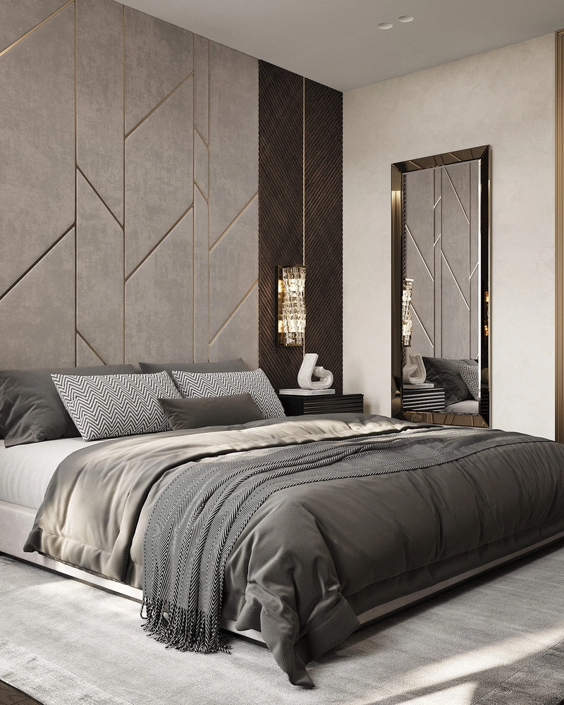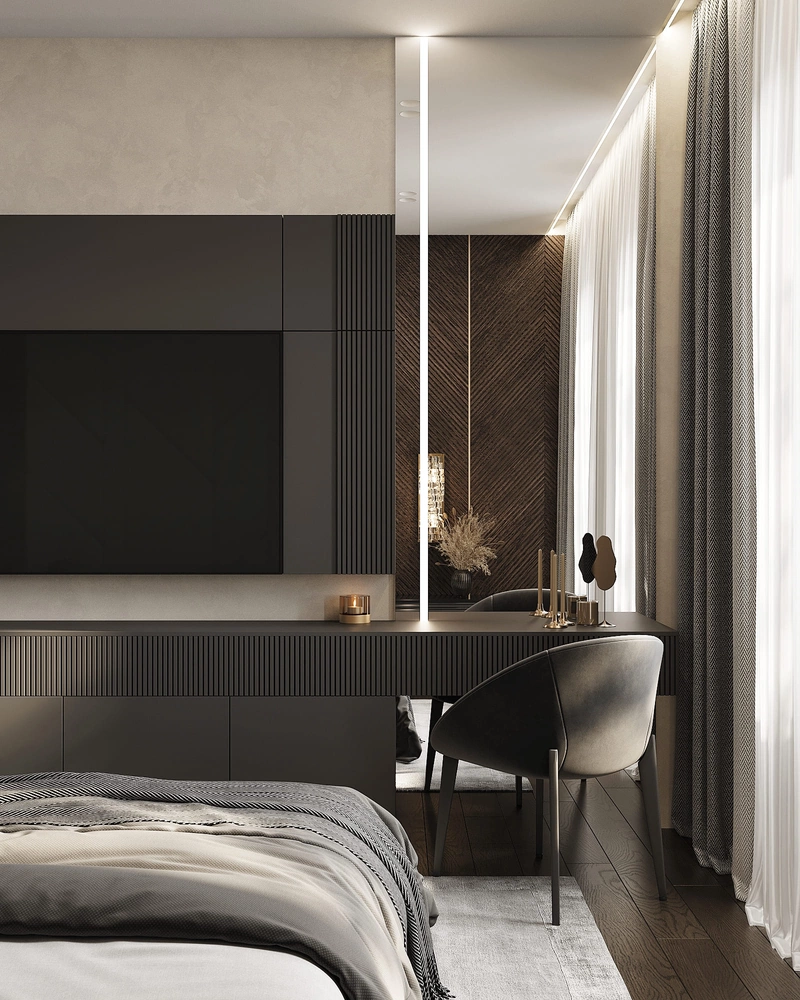 Комната оформлена в благородных оттенках серого и графитового. За изголовьем кровати – мягкие стеновые панели с геометрическим рисунком и подсветкой. В комнате предусмотрено рабочее место в виде консольного столика..