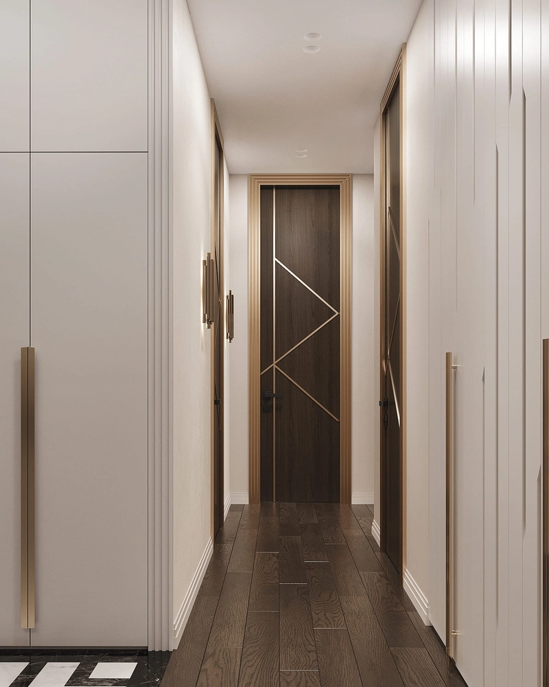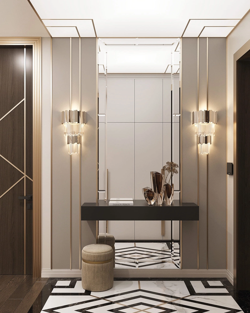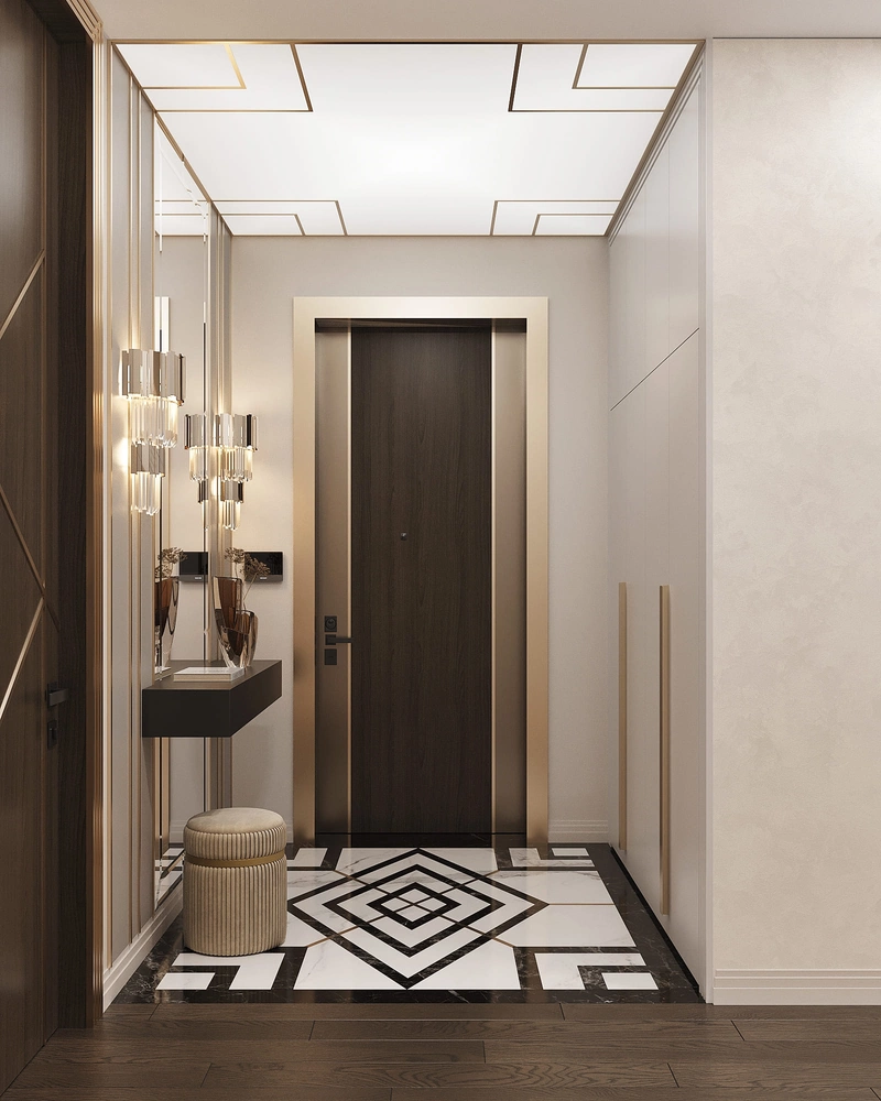 Просторная и эффектная. Встроенный шкаф скрывает верхнюю одежду и поддерживает порядок. Зеркальные панели визуально расширяют пространство. Световое панно на потолке создает эффектный акцент. Напольное покрытие из керамогранита с индивидуальным рисунком подчеркивает стиль ар-деко.