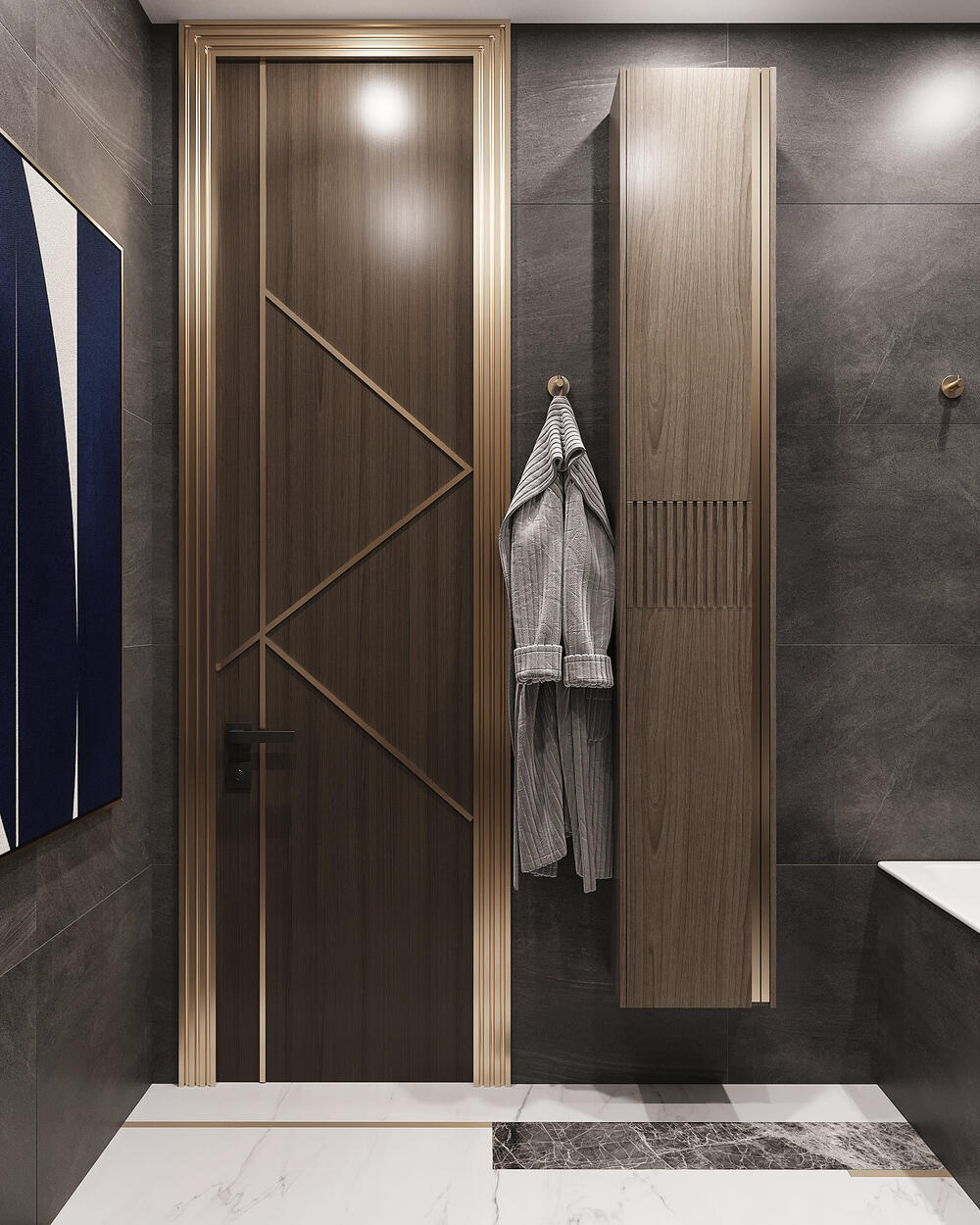 - Высокие двери в стиле ар-деко — подчёркивают высоту потолков и делают интерьер визуально просторнее.