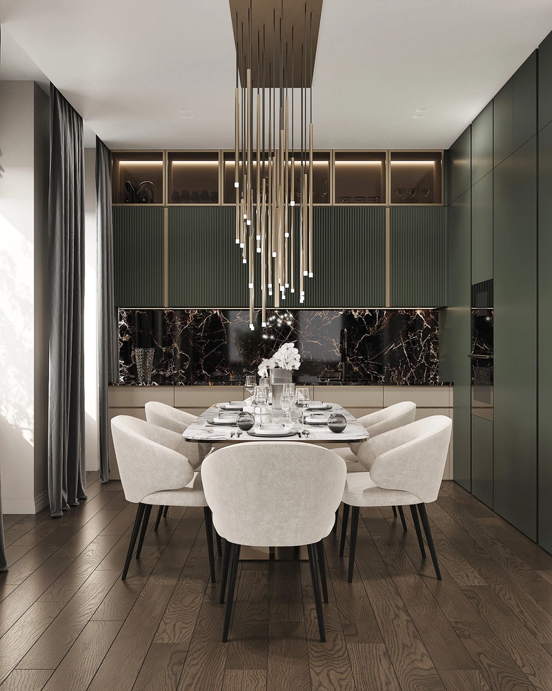 Кухня выполнена в тёмных глубоких оттенках с элементами ар-деко. Верхние шкафы кухонного гарнитура оснащены встроенной подсветкой.. Рабочая зона облицована чёрным мрамором с золотыми прожилками. В обеденной зоне стоит овальный стол с мраморной столешницей и мягкими стульями.