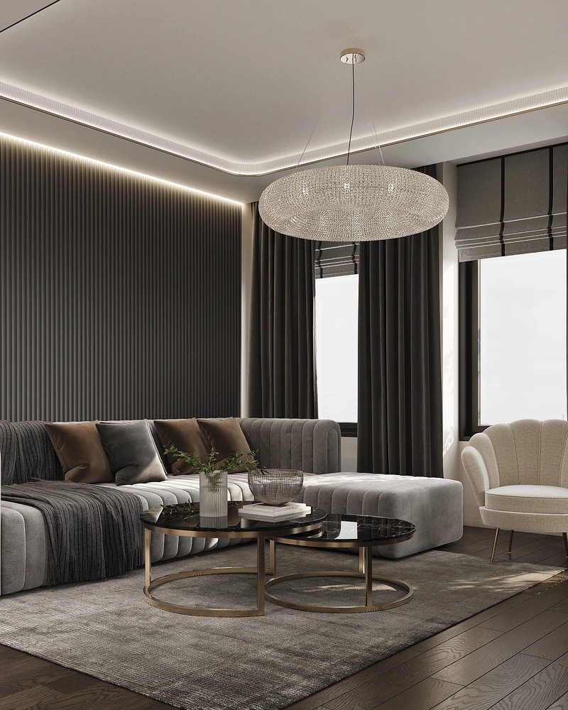 Гостиная оформлена в тёмных графитовых тонах с элементами латунных вставок и мягкими фактурами. Центральный элемент – большой модульный диван в велюровой обивке. Дополнительно установлено два небольших кофейных столика с мраморными столешницами и металлическими ножками.
