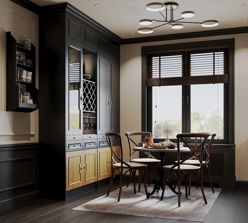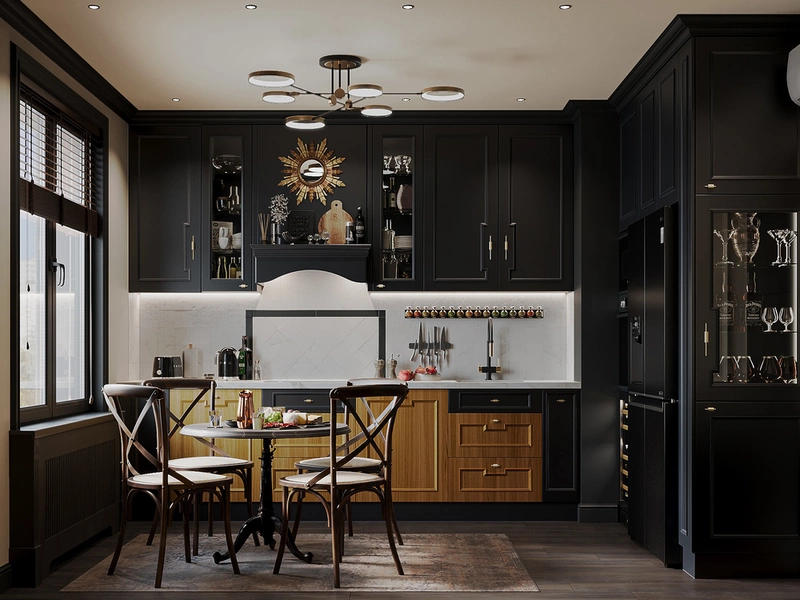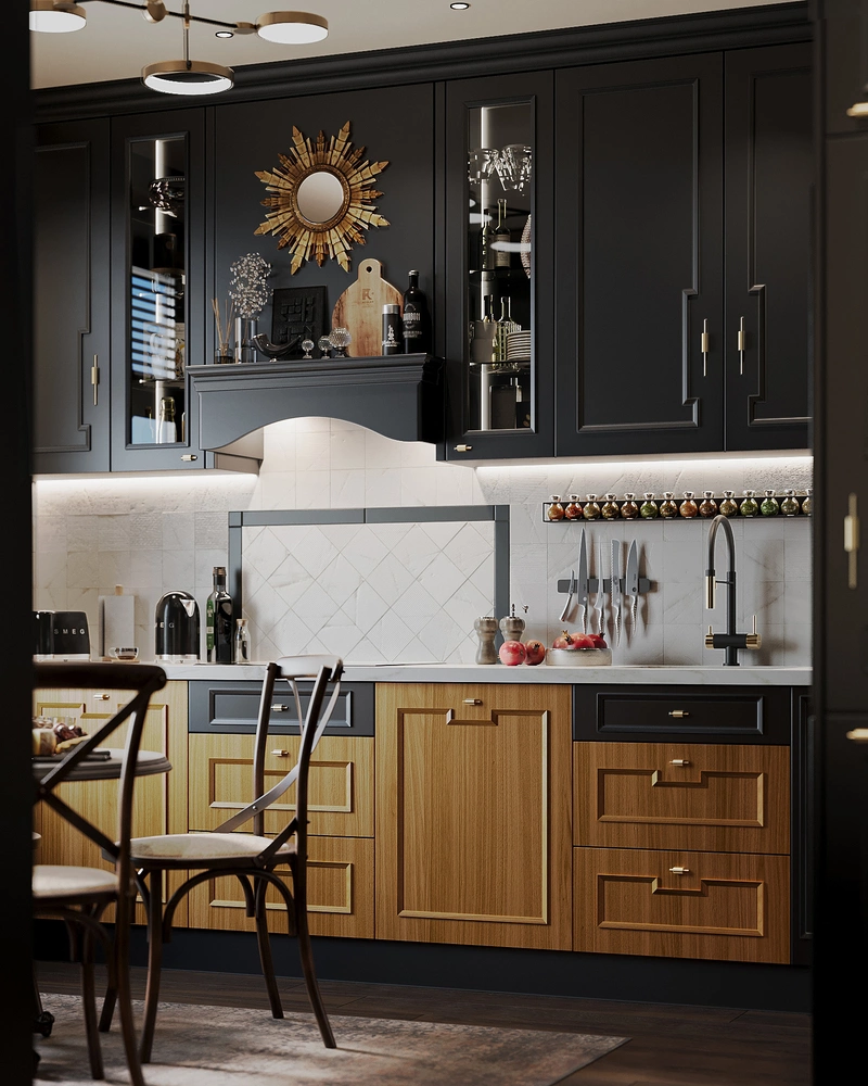 Главная идея кухни — показать, что классика может быть современной и удобной. Мы сделали ставку на тёмные фасады с изящными филёнками и добавили современные встроенные системы — от техники до подсветки. Благодаря этому кухня выглядит благородно, но при этом остаётся абсолютно практичной. Рабочие поверхности расположены так, чтобы готовить было легко и быстро, а рядом — обеденный стол для неспешных завтраков или ужинов с друзьями. Вечером подсветка создаёт мягкую атмосферу, и кухня превращается в место для общения и маленьких ритуалов.