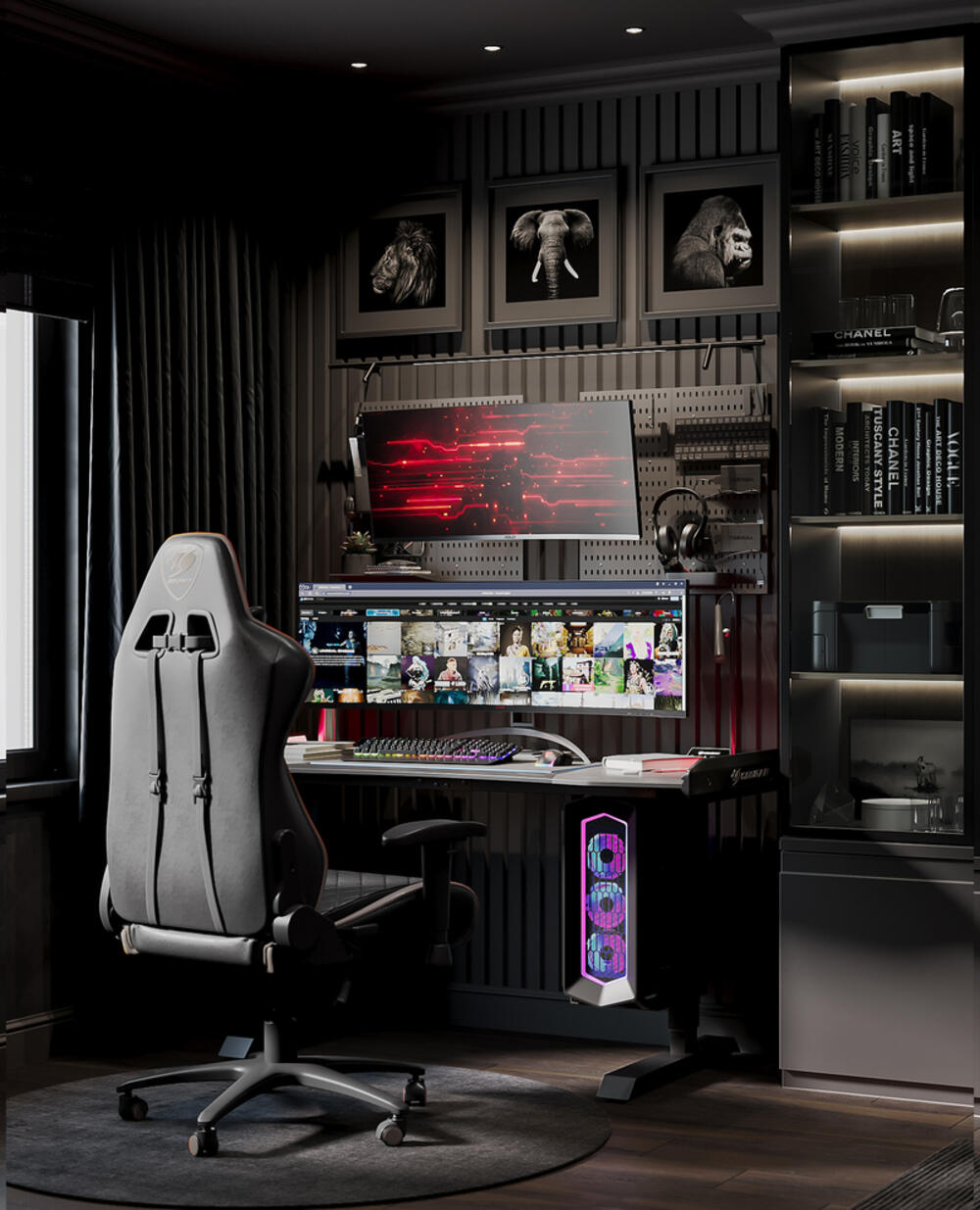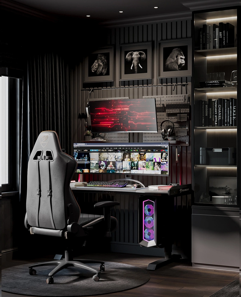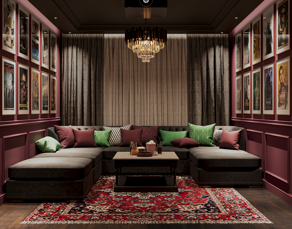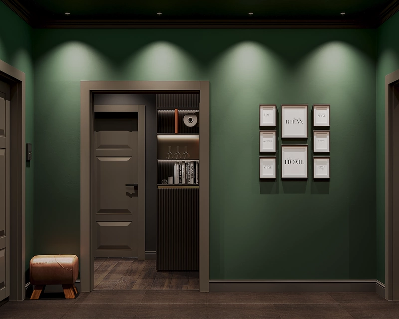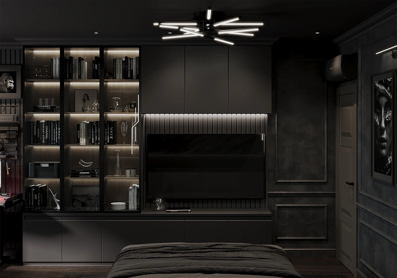 Гостиная стала сердцем квартиры и местом, где хозяин может полностью отключиться от работы. Заазчик увлекается кино, поэтому мы превратили комнату в настоящий домашний кинозал. Тёмные стены и мягкий свет создают атмосферу погружения, диван словно приглашает устроиться поудобнее с пледом и чашкой чая. Здесь можно собраться с друзьями на премьеру или провести вечер наедине с любимым фильмом. Благодаря разным сценариям освещения комната легко меняет настроение: днём — это живая гостиная для общения, вечером — пространство, где мир будто замирает и остаётся только экран