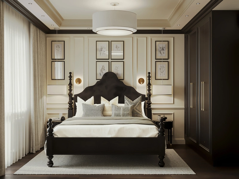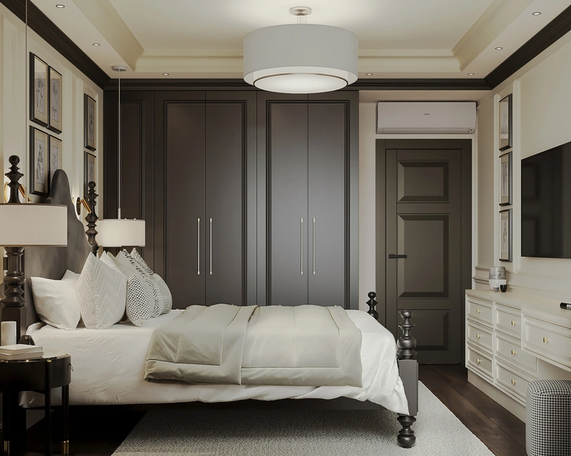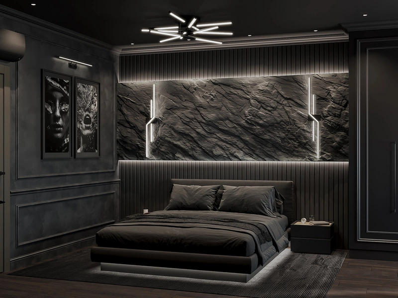 Уникальное сочетание стилей в спальне — тёмная спальня объединила классику и современные акценты: фактурная стена «скала», мягкая подсветка и лаконичные формы. Это создало атмосферу приватности и сделало комнату центром притяжения всей квартиры.