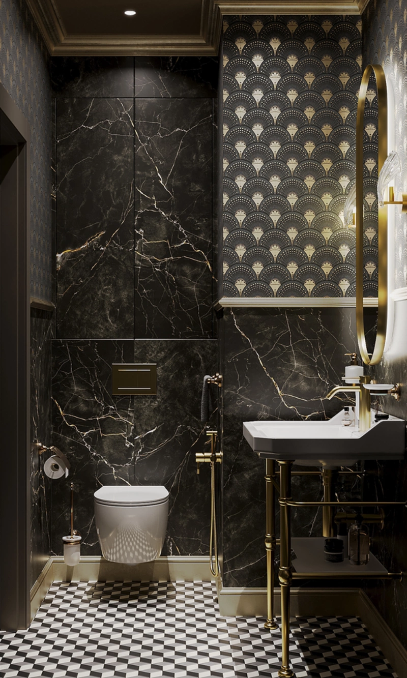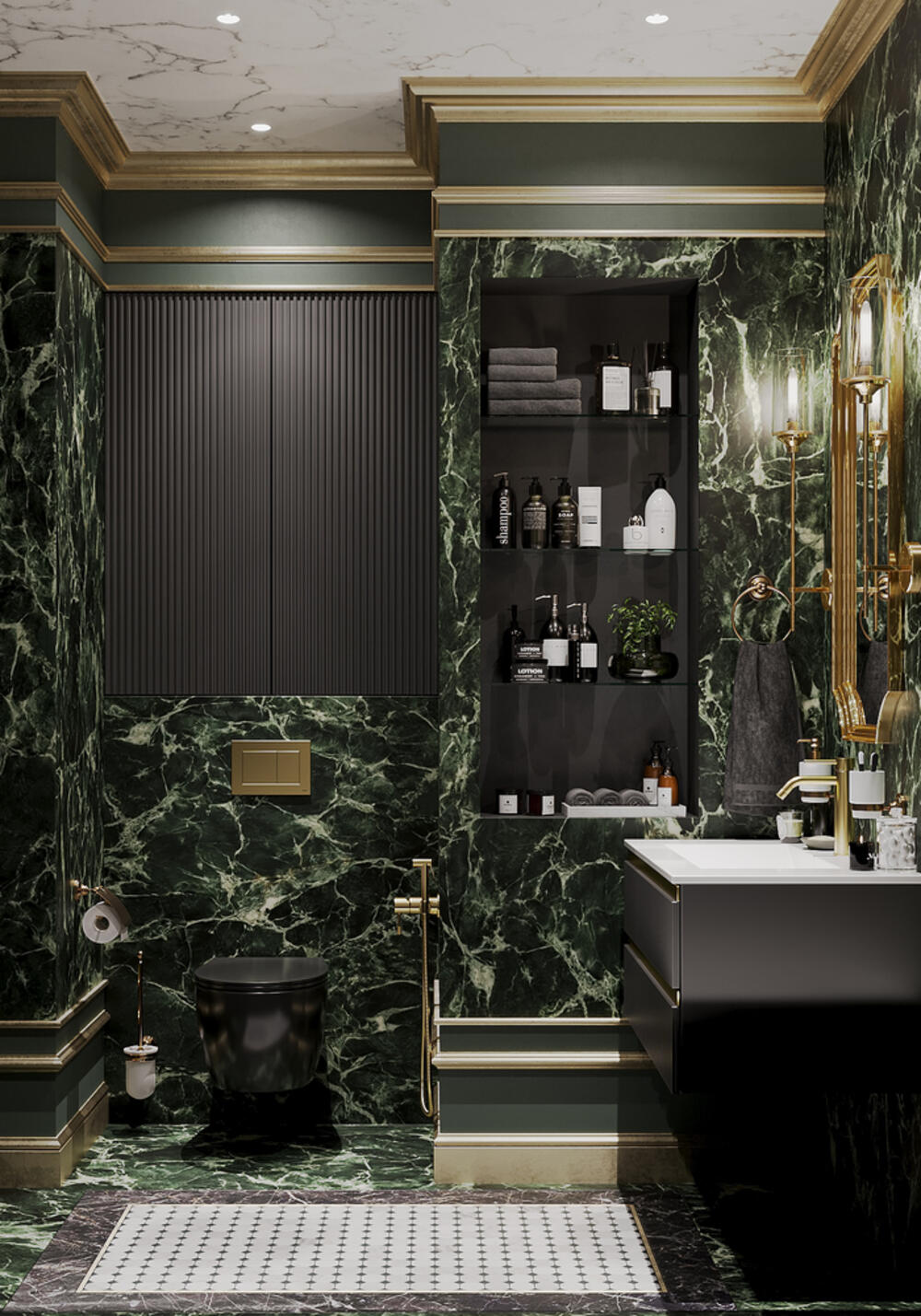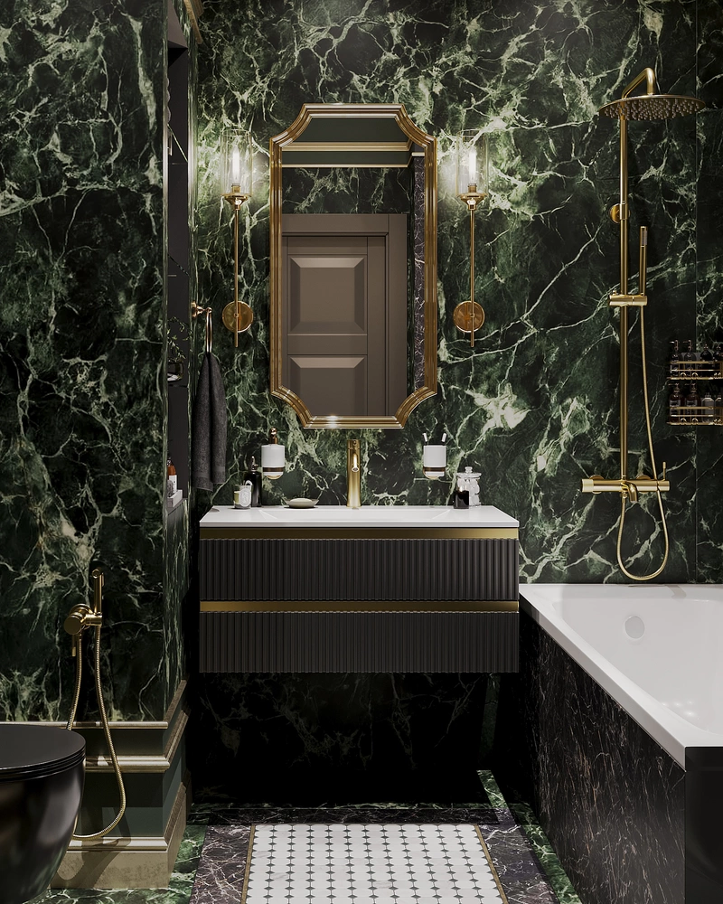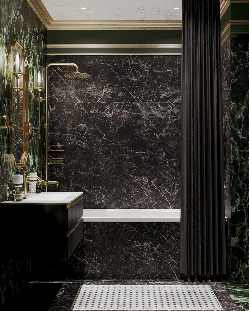 В основе интерьера — мраморные плиты тёмных оттенков. Мы выбрали их не только из-за выразительного вида, но и потому, что они практичны в уходе и долговечны. Золотая фурнитура добавляет интерьеру благородства и делает его более «тёплым». Ванну и душ разместили так, чтобы пользоваться ими было удобно каждый день. Умывальник с выдвижными ящиками решает вопрос хранения — всё нужное всегда под рукой, но скрыто от глаз. Освещение продумано так, чтобы зеркало давало правильный свет для ухода за собой. Эта ванная совмещает красивый внешний вид и удобство для повседневной жизни.