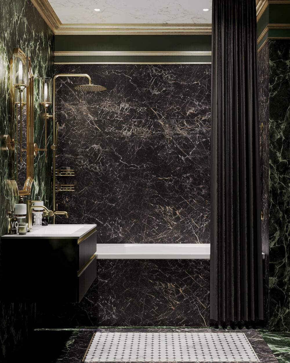 Стиль этой квартиры эклектика с акцентом на классику. Палитра построена на насыщенных глубоких оттенках: тёмных, почти чёрных, в сочетании с зелёным мрамором и золотыми деталями.