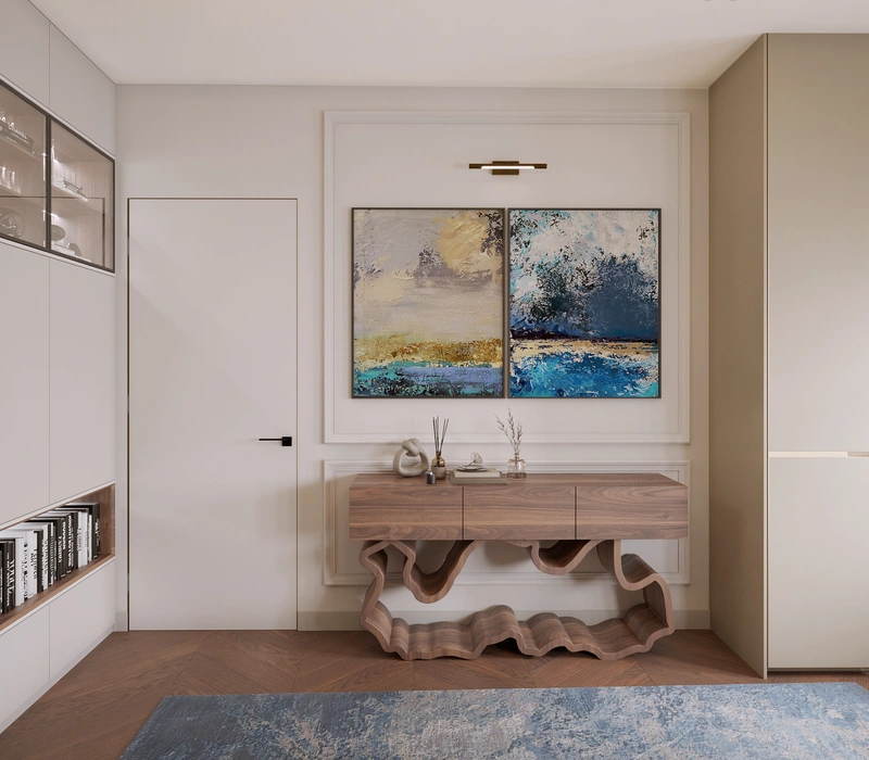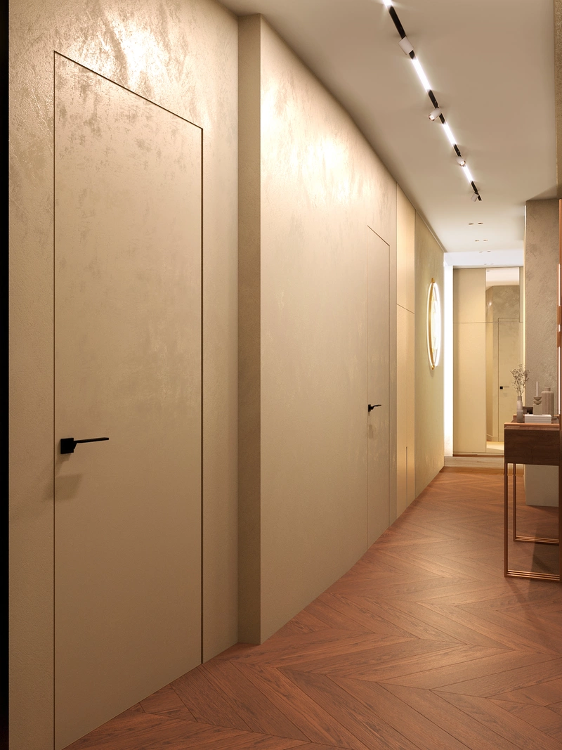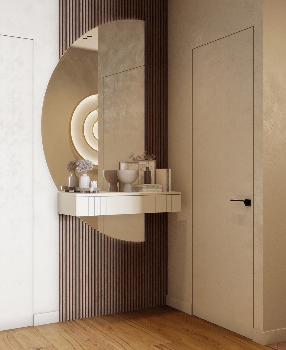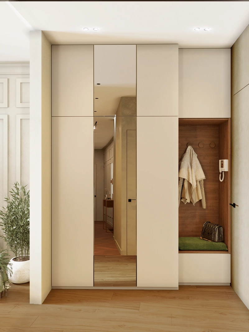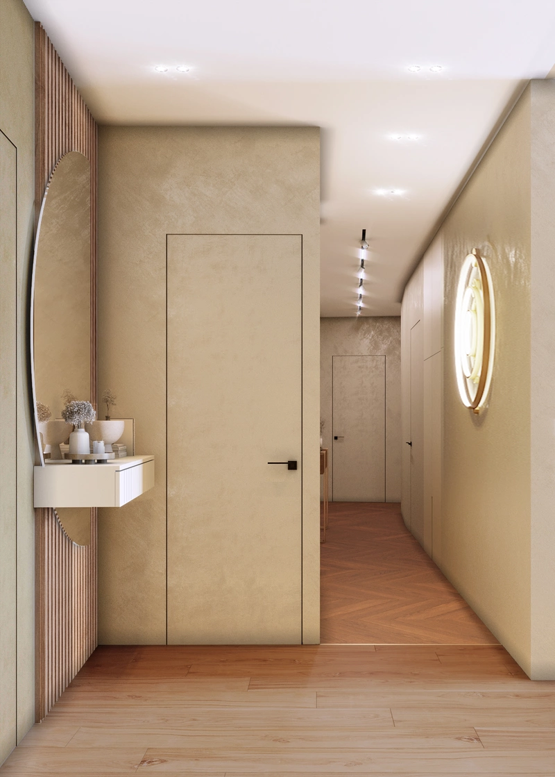 При входе предусмотрена подвесная консоль с зеркалом — здесь удобно оставить мелочи или привести себя в порядок перед выходом. Рядом расположен шкаф для верхней одежды, чтобы прихожая оставалась аккуратной. В коридоре скрыта за раздвижными дверями прачечная зона. Дополнительно выделено техническое хранение — небольшое помещение для оборудования и хозяйственных вещей.