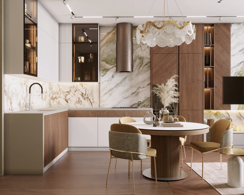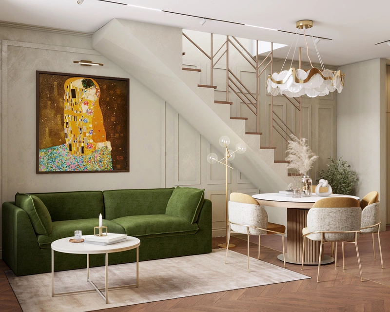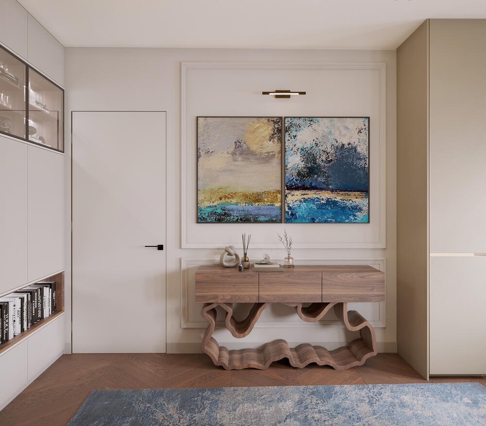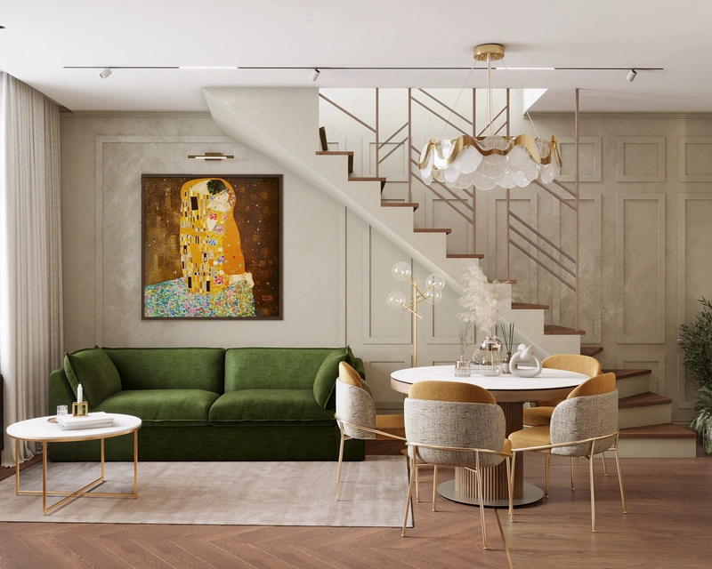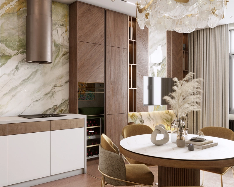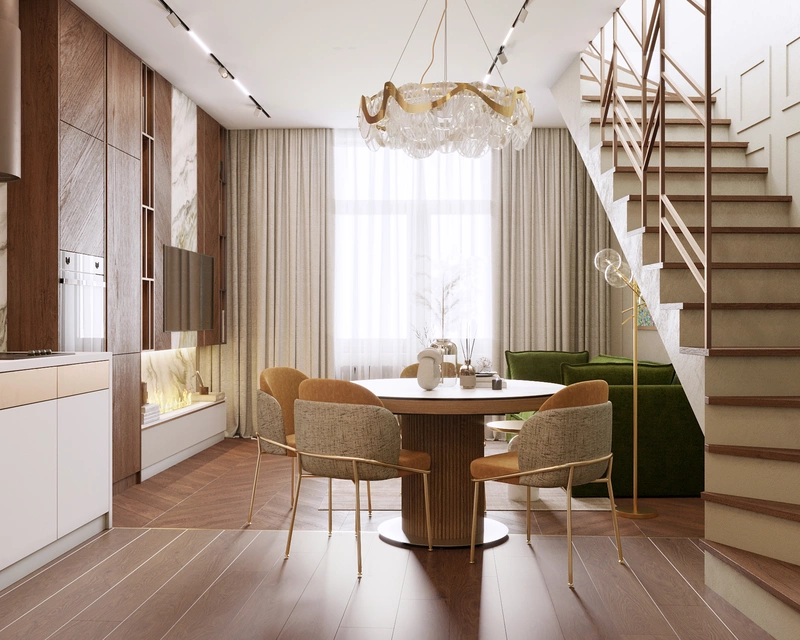 Интерьер выполнен в спокойной цветовой гамме с яркими акцентами и сочетает разные фактуры: дерево, латунь, декоративную штукатурку и камень. За счёт этого квартира выглядит свежо, динамично и в то же время уютно. Каждая зона продумана с учетом сценариев жизни семьи — от кухни-гостиной для совместных вечеров до личных комнат для детей и родителей.