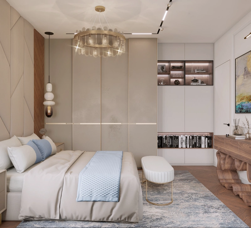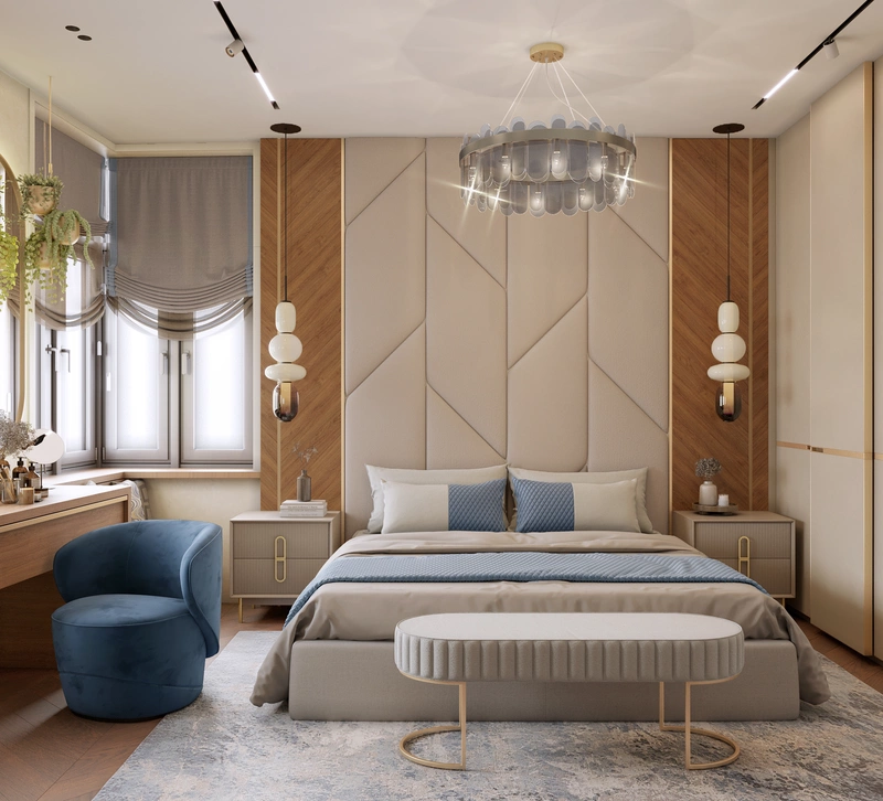 Мягкая отделка стены за изголовьем не только красиво смотрится, но и делает кровать особенно удобной для вечеров с книгой или ноутбуком. Всё пространство спроектировано так, чтобы в нём было легко расслабиться и поддерживать порядок.