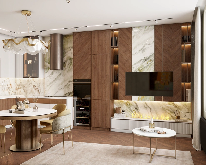 Кухонный фронт в одной стилистике с ТВ-зоной — кухня и гостиная объединены общим оформлением, что делает пространство цельным и аккуратным.