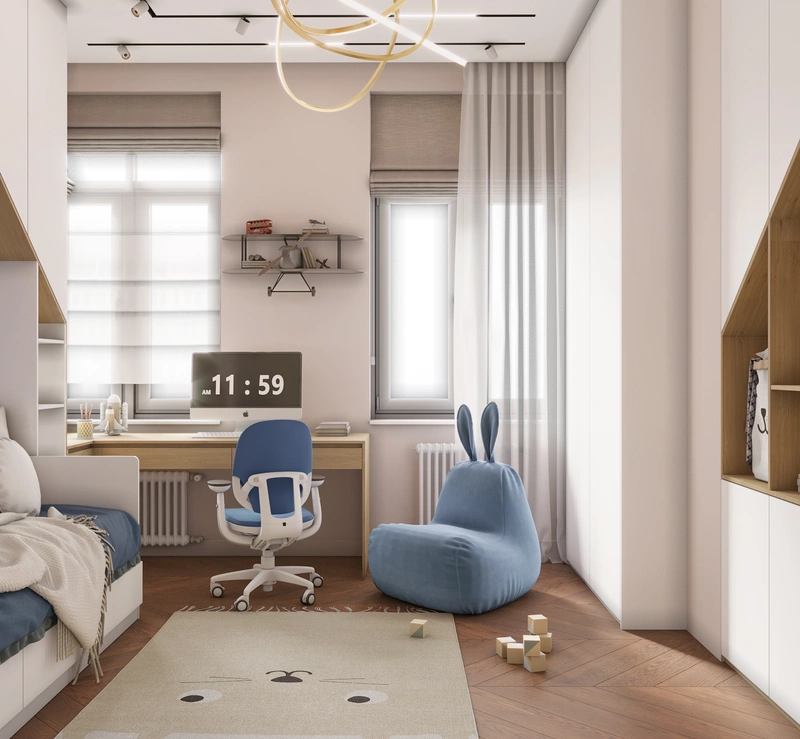Эта комната отлично подойдёт и для игр, и для учебы. Рабочее место расположено у окна — здесь достаточно света для занятий, а длинная столешница позволяет разместить компьютер и книги одновременно.