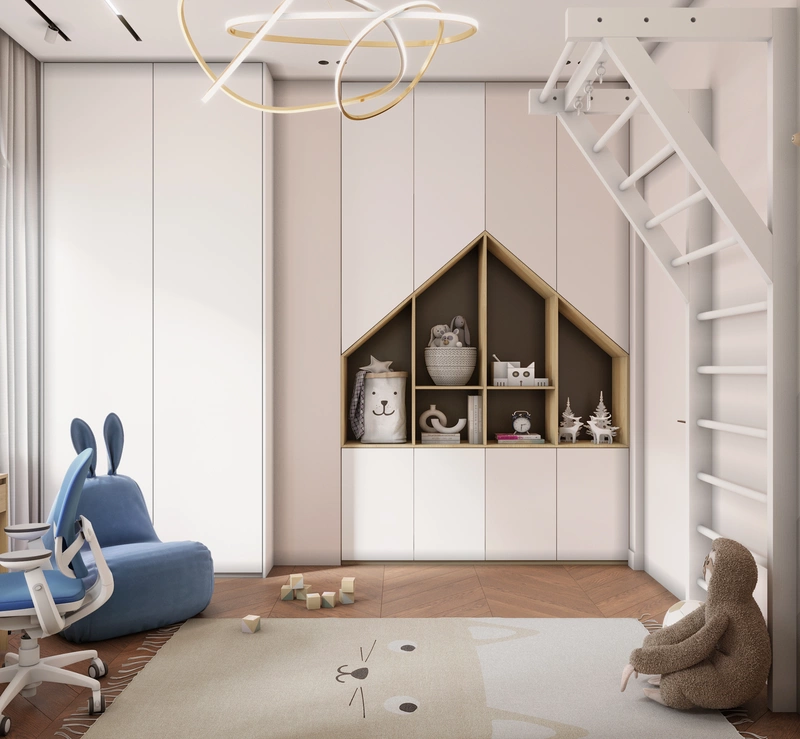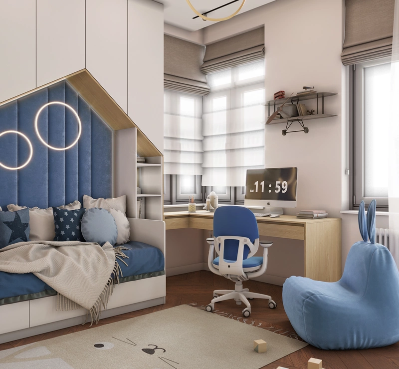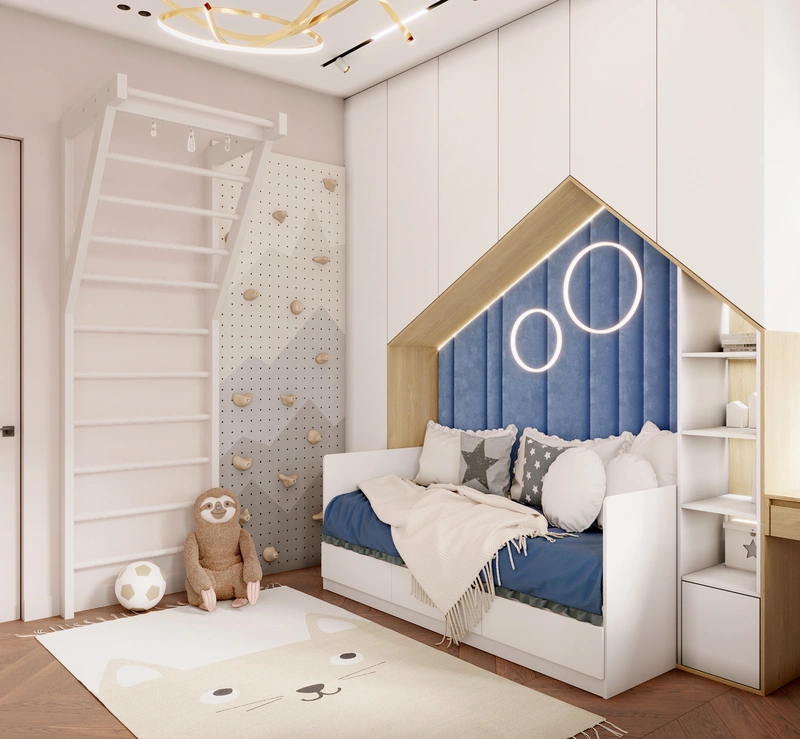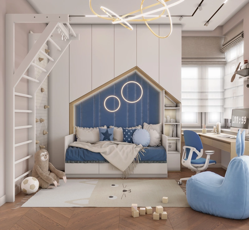Кровать с мягким изголовьем оформлена в форме домика и дополнена встроенными шкафами, чтобы хранение было максимально удобным и не занимало лишнее место. Синие акценты выбраны не случайно — они добавляют энергии и при этом смотрятся сдержанно, так что интерьер будет актуален и по мере взросления ребёнка.