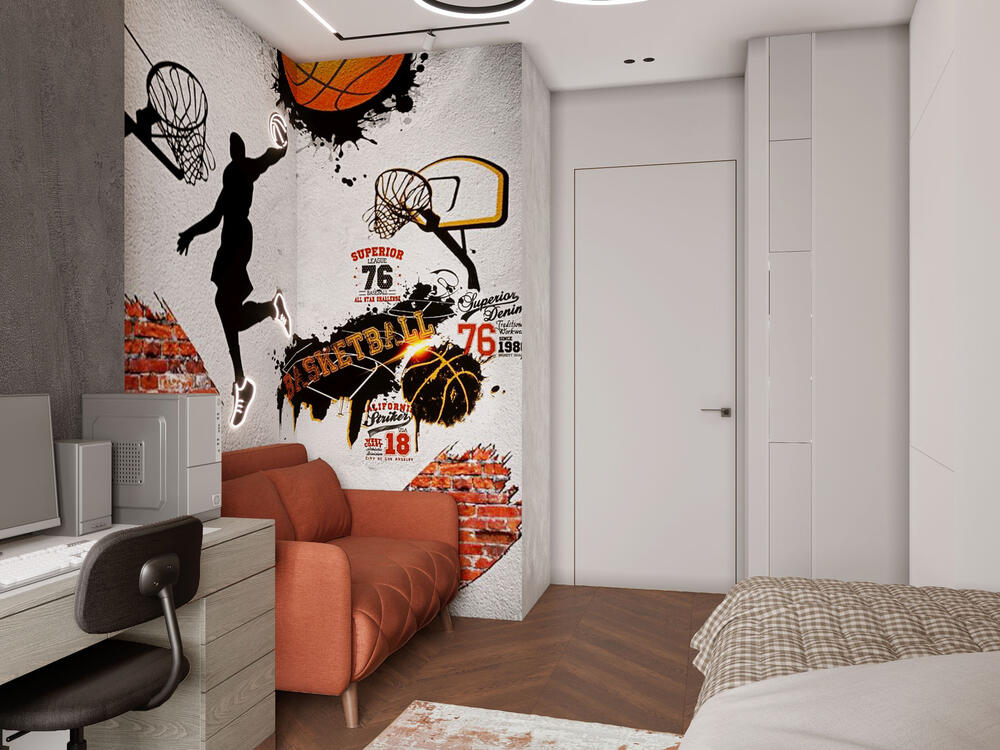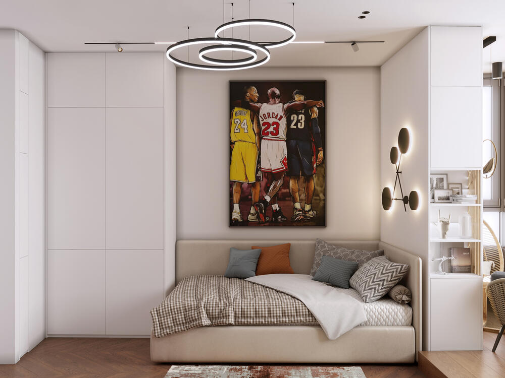 Эта комната сразу задаёт характер — графичная стена с акцентом делает её яркой и динамичной. Мы спроектировали пространство так, чтобы здесь было удобно и учиться, и отдыхать. Рабочий стол у окна даёт много света для занятий, кровать и шкаф расположены компактно, а середина комнаты остается свободной.