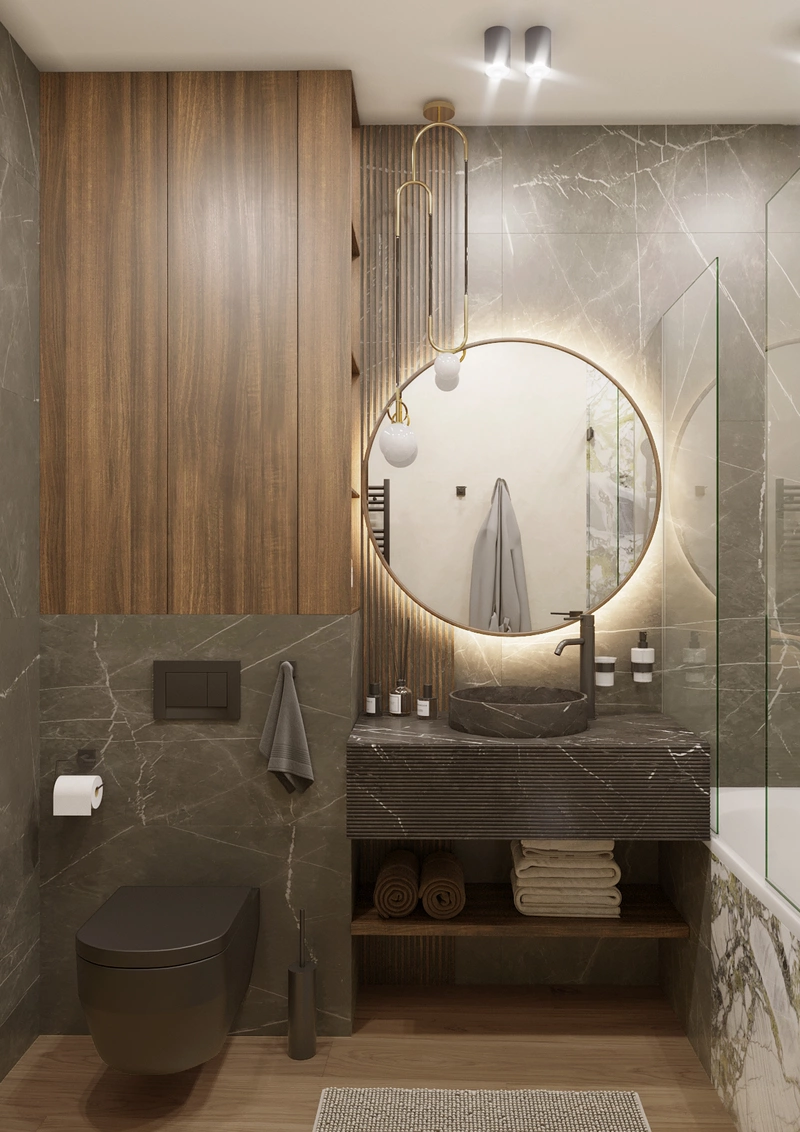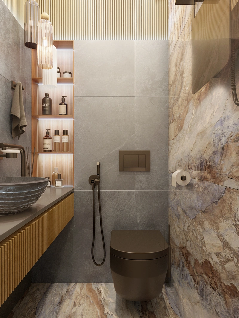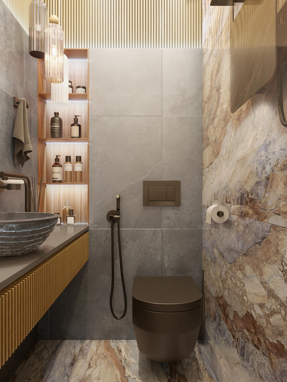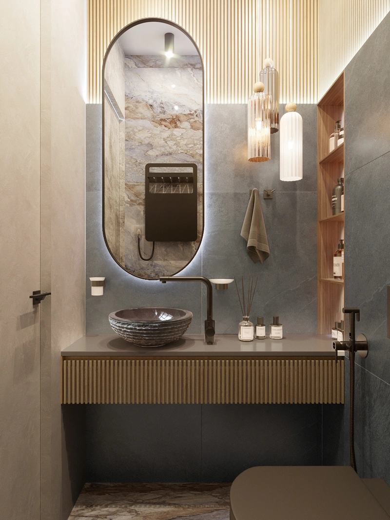 Небольшой, но очень удобный. Здесь есть всё нужное: раковина, унитаз и открытые ниши для хранения. Подвесная тумба облегчает уборку. Подсветка и зеркало делают пространство визуально больше и светлее. Простое и практичное решение для повседневного использования.