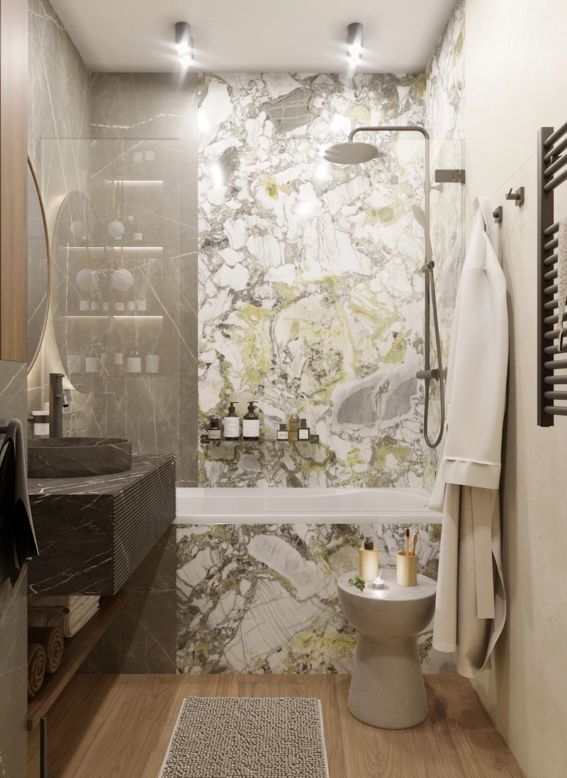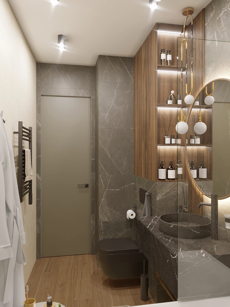 Хранение встроено в ниши, поэтому всё под рукой и при этом не загромождает интерьер. Отделка керамогранитом практична в уходе и смотрится аккуратно. За счёт света и спокойной цветовой гаммы ванная ощущается просторнее, чем есть на самом деле.