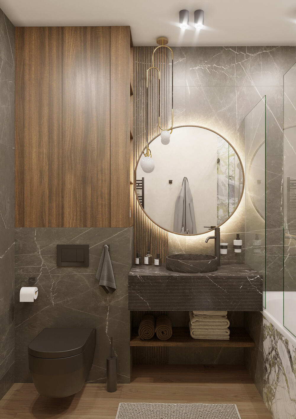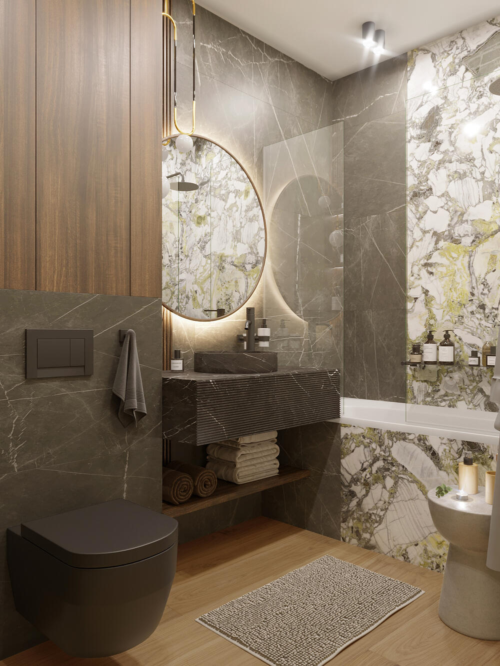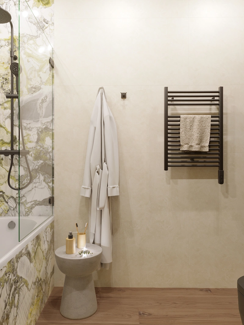В основной ванной мы сделали упор на удобство и лёгкое использование пространства. Здесь разместили ванну и душевую зону за стеклом — это решение экономит место и делает комнату более функциональной.