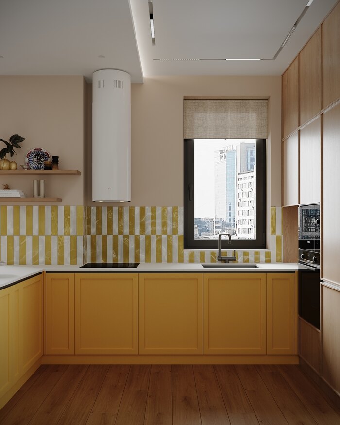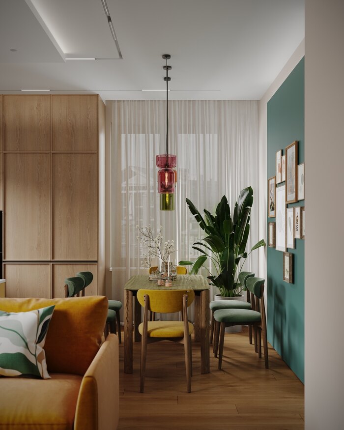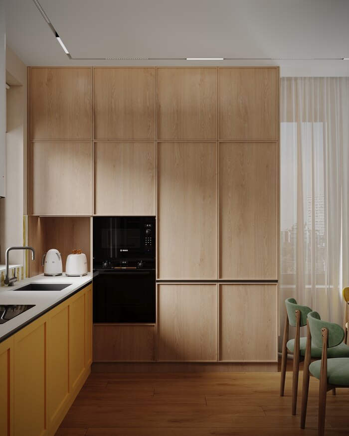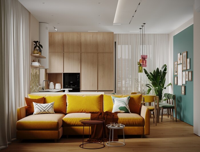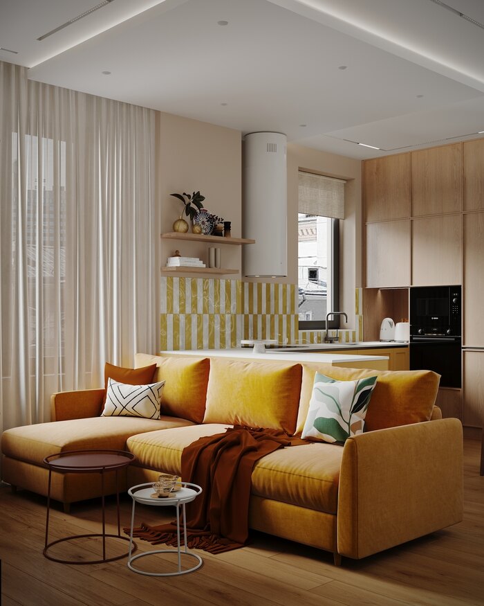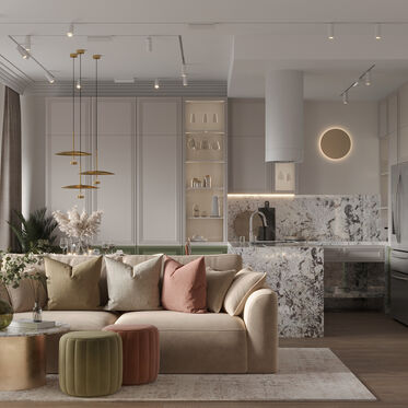 Сделать яркую светлую квартиру с акцентом на зону кухни-гостинной, как места для объединения всех членов семьи