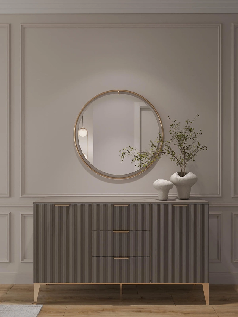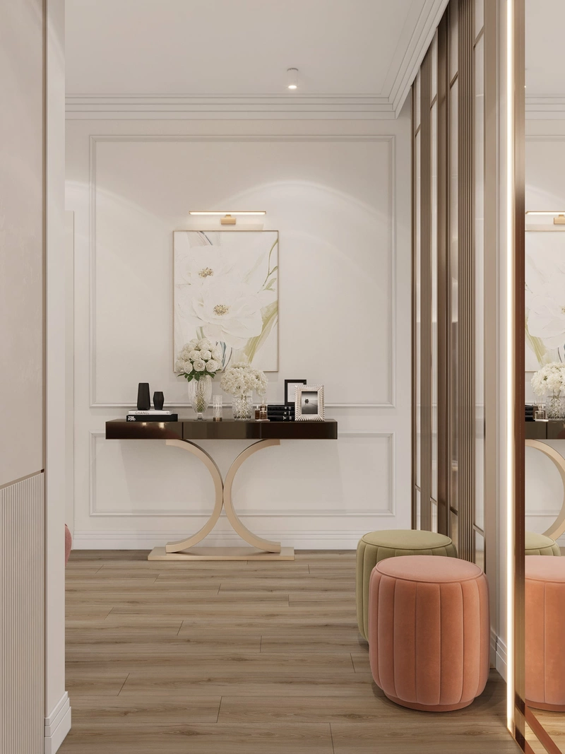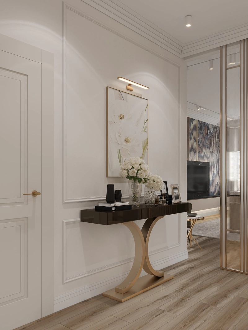 В прихожей предусмотрено всё необходимое для комфортного использования каждый день. С одной стороны от входа — консоль с настенным светильником и крупной картиной. Эта композиция не только декоративна, но и функциональна: на столешнице удобно разместить ключи, документы или мелочи.