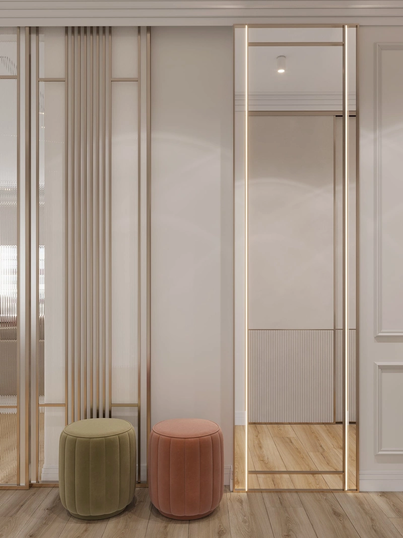Главный декоративный приём — перегородки с латунным профилем и рифлёным стеклом. Они разделяют пространство, сохраняя ощущение воздуха и света. Вертикальные линии и подсветка усиливают ритм и глубину композиции.