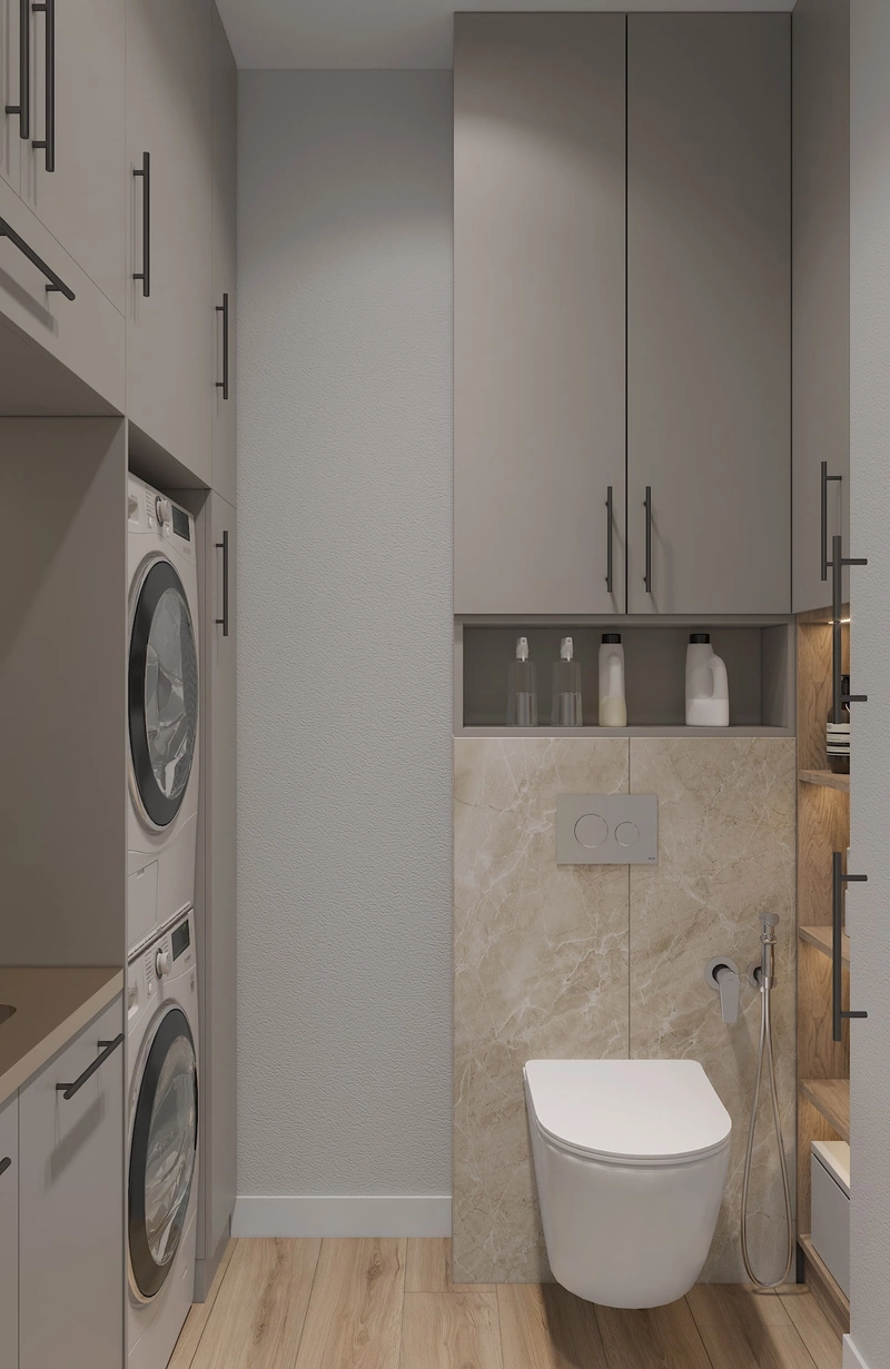 Дополнительно в помещении предусмотрен подвесной унитаз — практичное решение, которое расширяет функциональность комнаты. Вся мебель выполнена в нейтральной палитре, за счёт чего даже техническая зона выглядит спокойно и вписывается в общий стиль интерьера.
