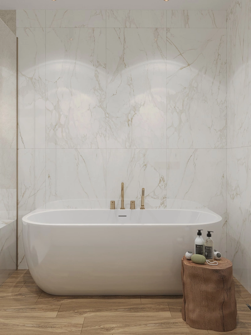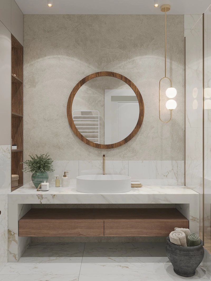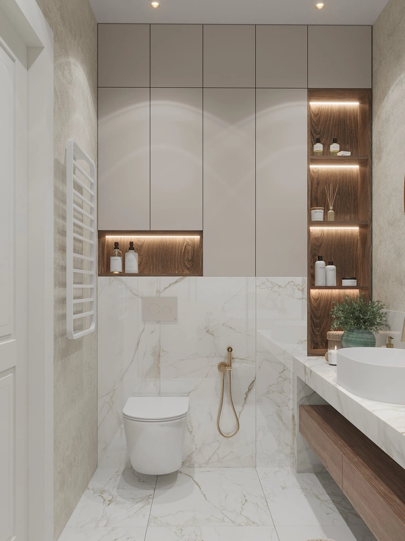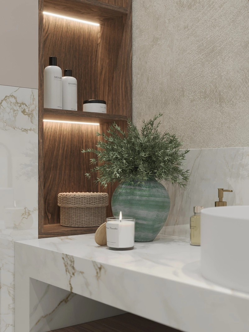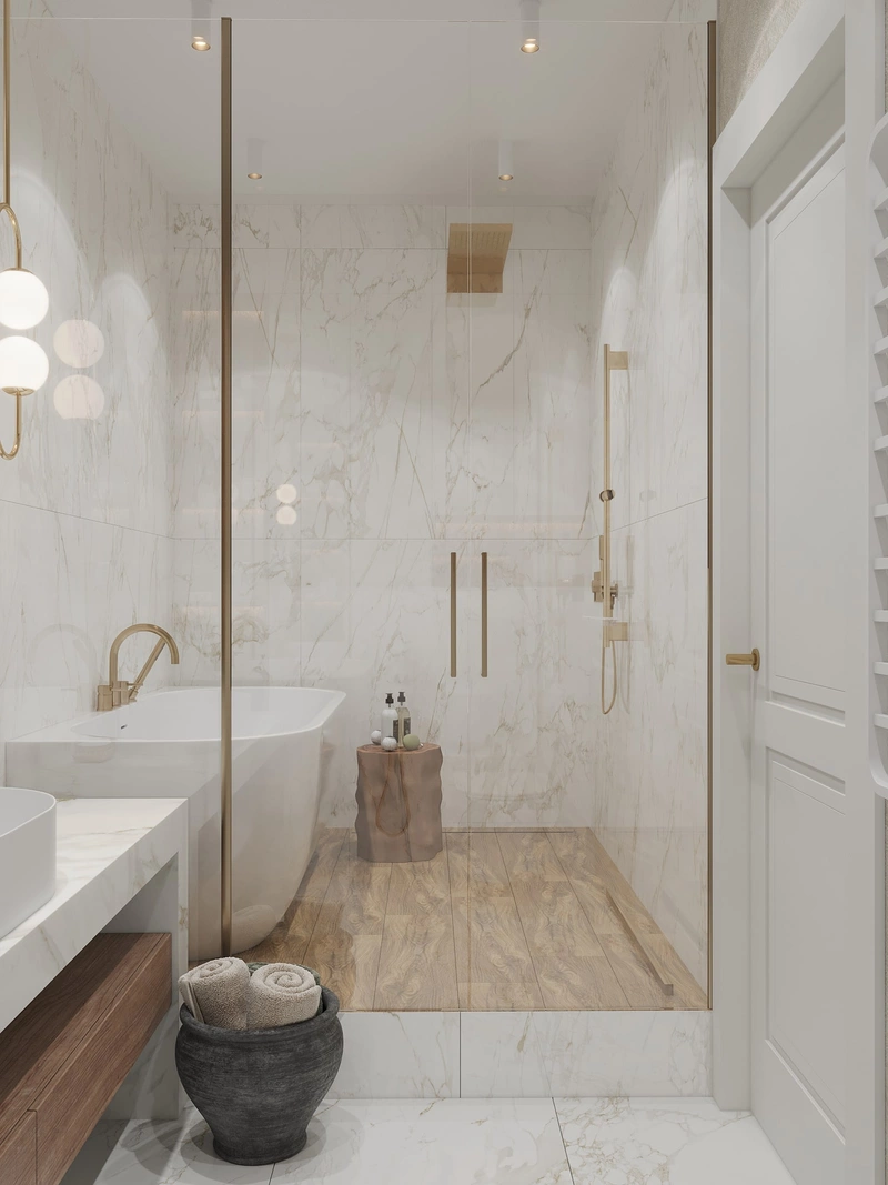Ванная комната выполнена в светлой гамме с отделкой под мрамор — лёгкой, благородной, но не вычурной. Большоформатная плитка с тёплым бежево-золотым рисунком визуально расширяет пространство и придаёт ему статус. Душевая зона оформлена акцентной плитой, а тёплый текстурный декор добавляет ощущение уюта.