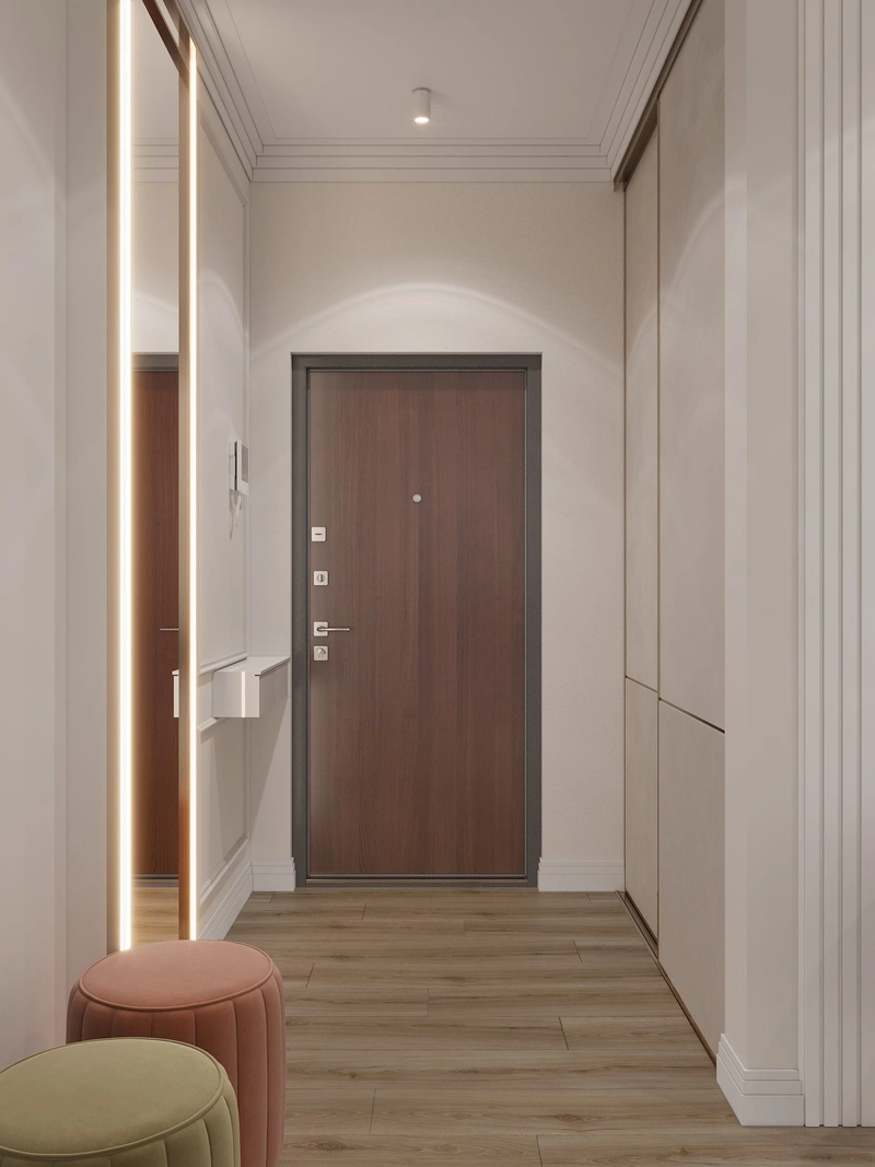 Помещение не перегружено: благодаря светлой отделке, акцентным перегородкам и встроенному освещению прихожая выглядит торжественно, но остаётся функциональной. Пространство спланировано так, чтобы легко поддерживать порядок и создавать первое впечатление о всём интерьере.