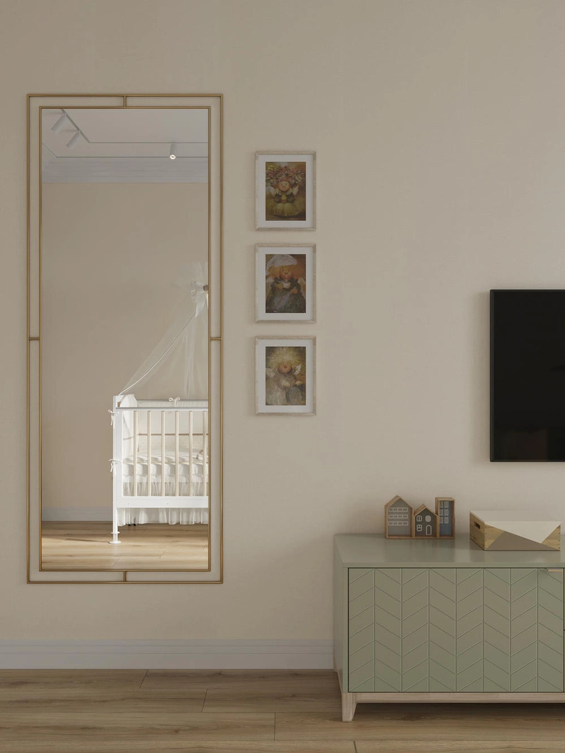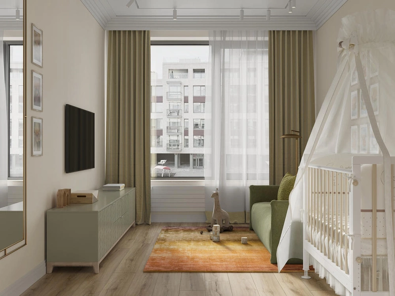 Детская комната получилась универсальной — такой, как и просили заказчики. Пространство оформлено мягко и спокойно: светлые стены, тёплое дерево на полу и лёгкие акценты в текстиле. В центре — белоснежная детская кроватка с балдахином, рядом — удобный зелёный диван, который при необходимости раскладывается и превращается в полноценное спальное место.