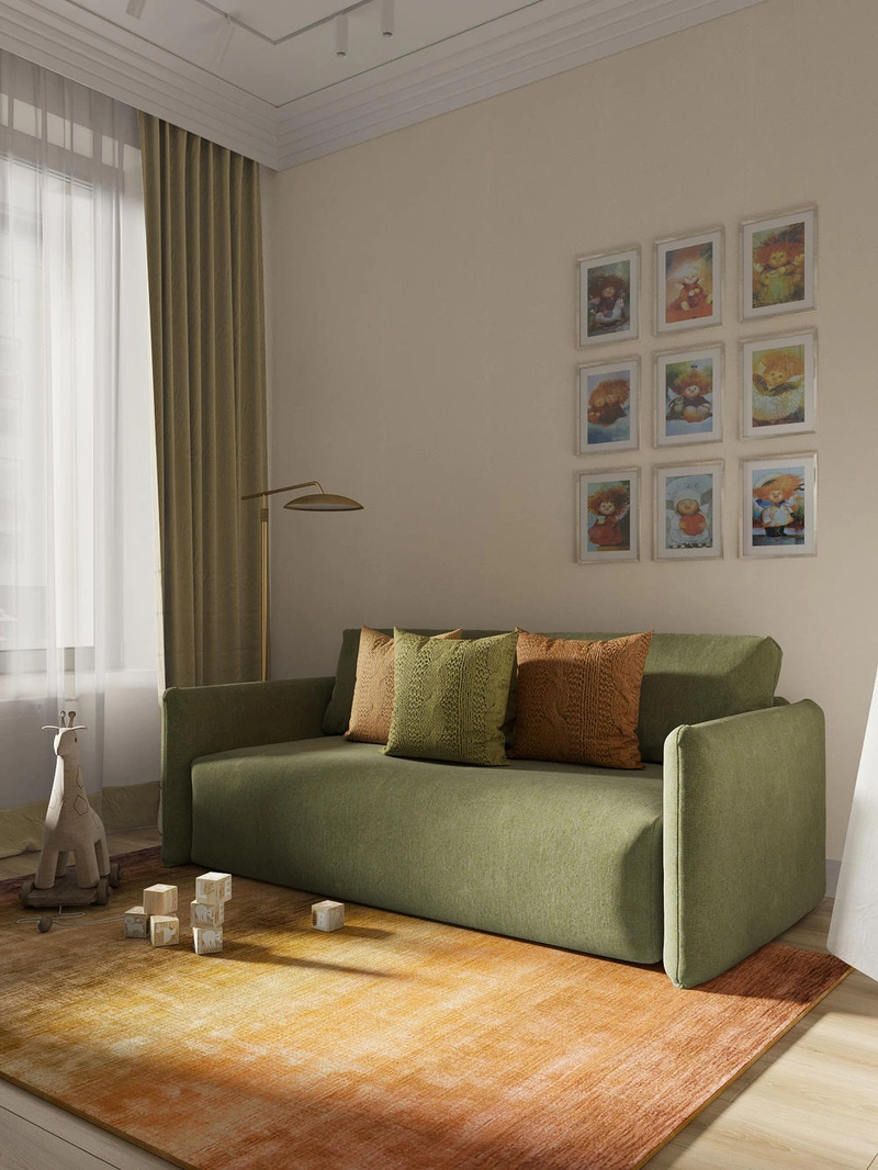 Эта комната легко подстраивается под разные сценарии. Днём здесь комфортно находиться с ребёнком, а при приезде гостей — использовать как гостевую. Окно оформлено двойными шторами: плотными для уединения и лёгкими тюлевыми для рассеянного света.