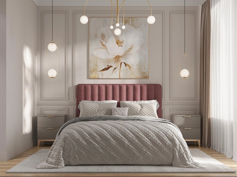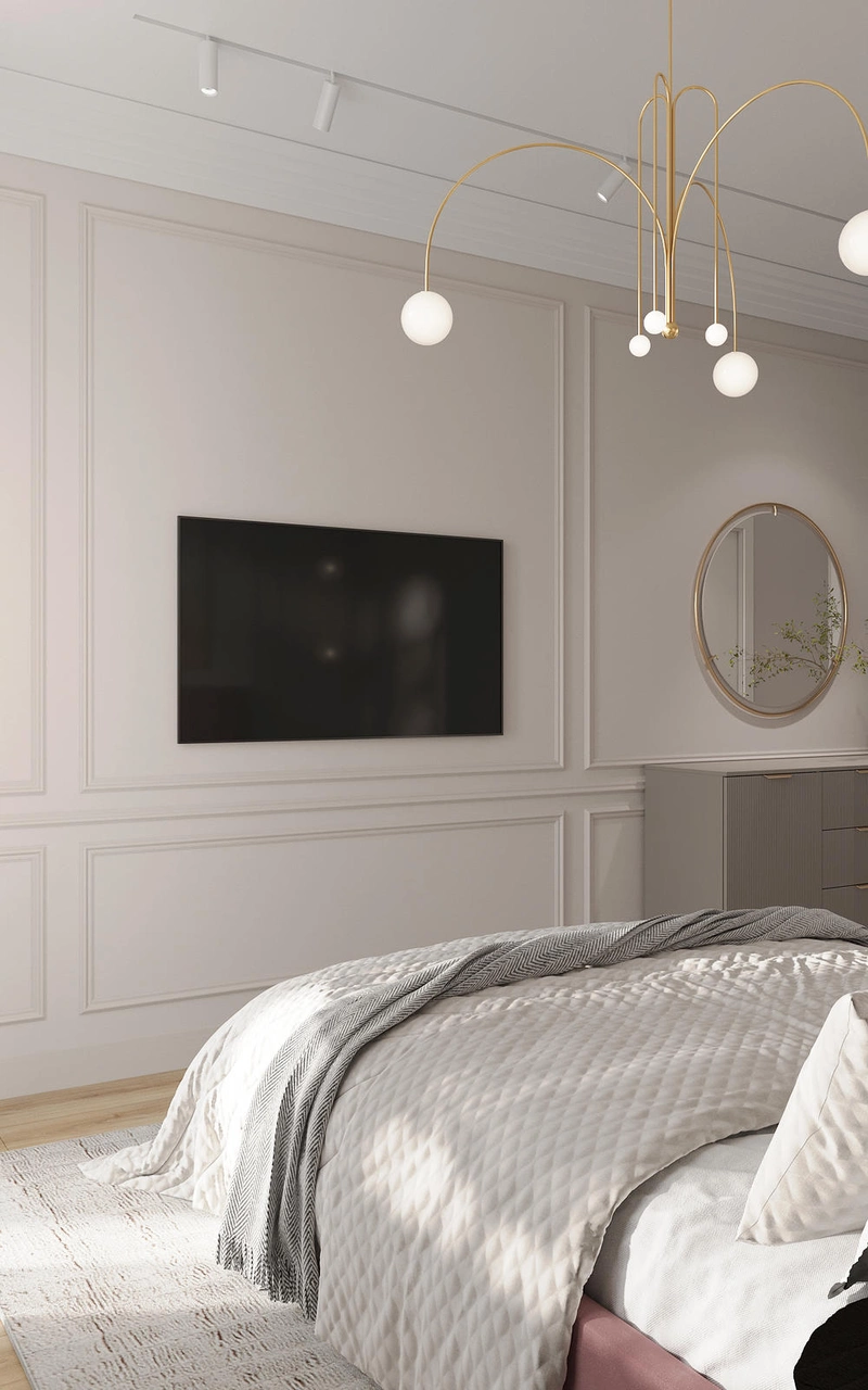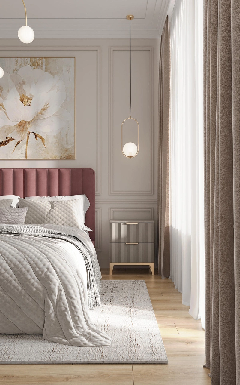 Мастер-спальня получилась очень спокойной и собранной — здесь всё про отдых. Главный акцент — мягкое изголовье кровати в пыльно-розовом бархате, оно сразу задаёт нужное настроение. По бокам — симметричные тумбы и светильники, которые дают приятный мягкий свет. Стены с классическими молдингами, но без перегруза — просто деликатная рамка для всего, что внутри.