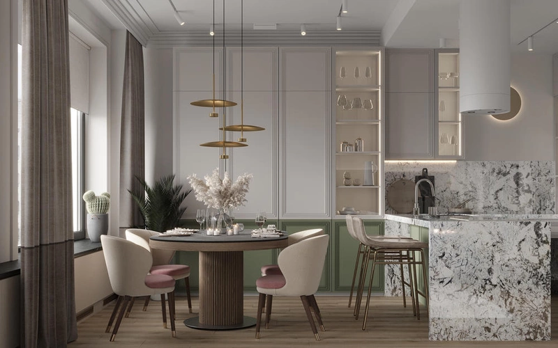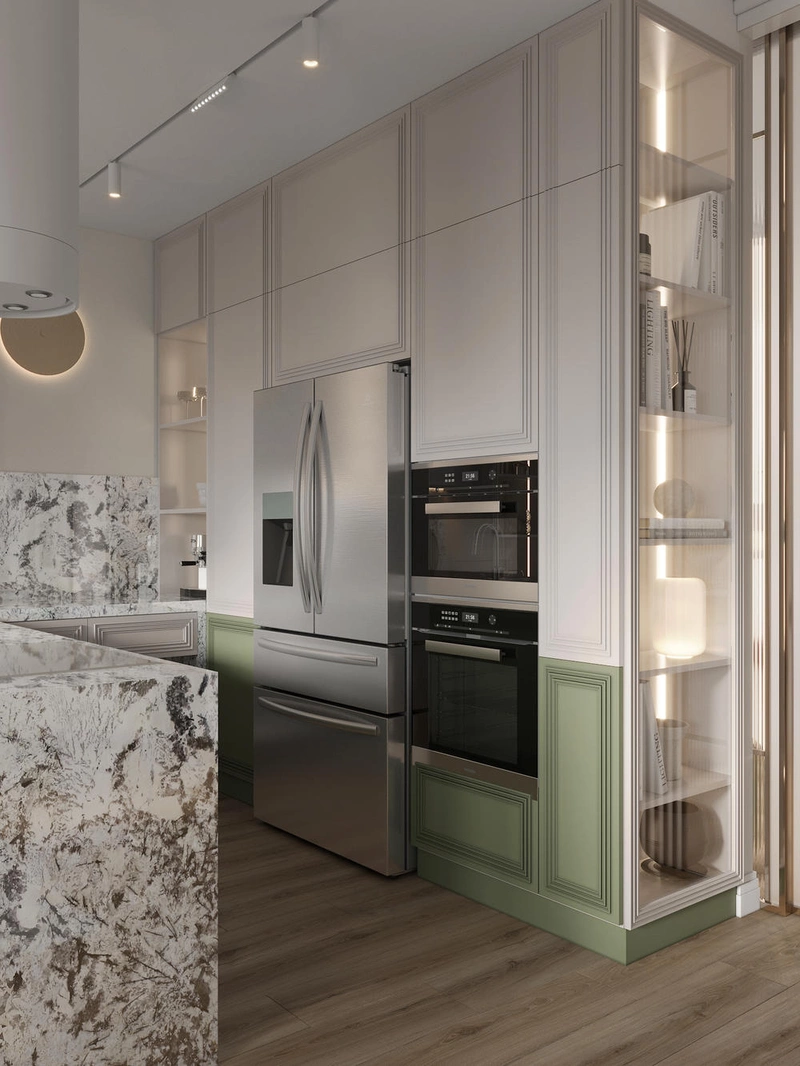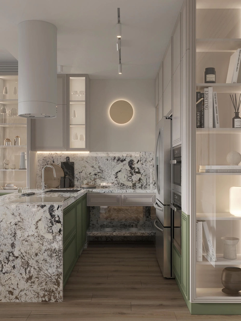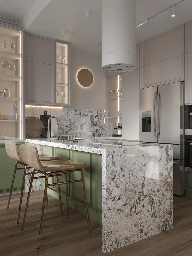 Кухня оформлена в сдержанных светлых тонах с зелёными нижними фасадами. Акцентом выступает каменная столешница и фартук из натурального гранита с выразительным рисунком. Пространство дополнено полуостровом, за которым удобно как готовить, так и общаться. У окна предусмотрена зона отдыха — широкая столешница заменяет подоконник и служит уютным местом для чтения или чаепития.