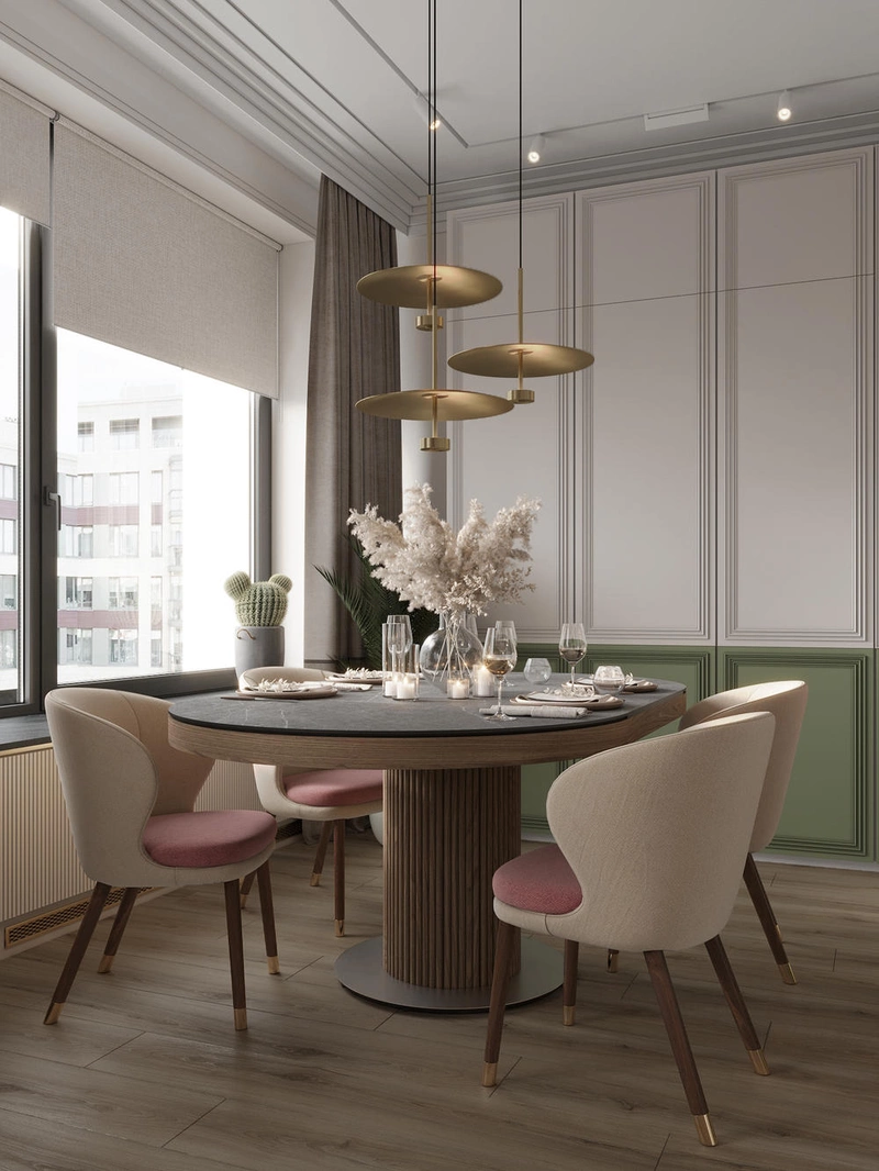 Акценты в виде розового, оливкового и тёплого зелёного добавляют интерьеру характера и живости, но не нарушают общей сдержанности. Стиль получился лёгким и благородным — с вниманием к деталям и ощущением уравновешенного комфорта.