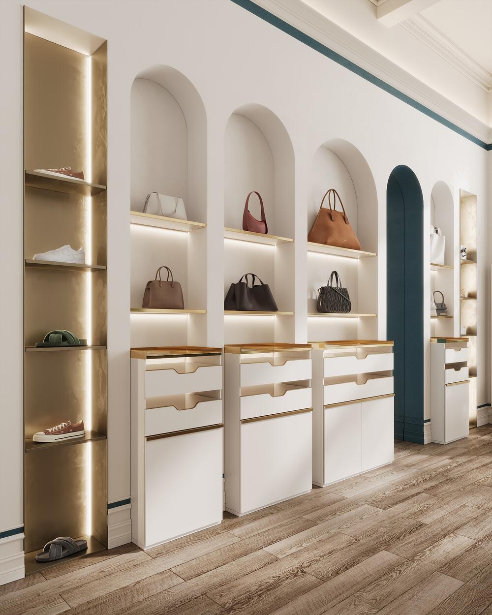 Вдоль стены с арочными проёмами расположены ниши со встроенными комодами и подсветкой. Здесь размещены коллекции сумок: каждая ниша индивидуально подсвечена, что подчёркивает форму и текстуру изделий. Нижние модули с выдвижными ящиками выполняют функцию хранения.