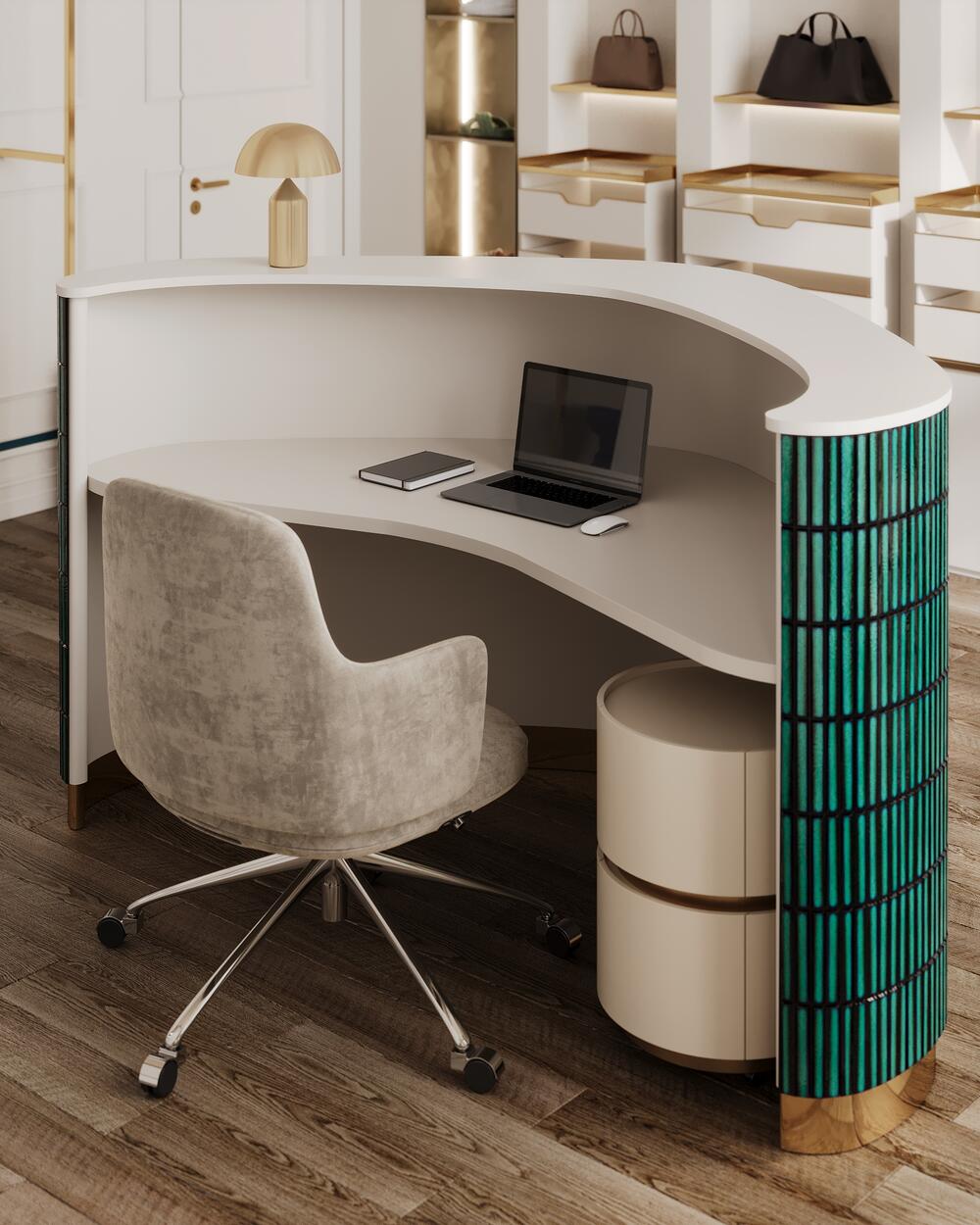 Центральный элемент шоурума — нестандартная стойка ресепшн с облицовкой бирюзовой плиткой ручной работы и латунным цоколем. Форма стойки повторяет архитектурные оси помещения, делает её выразительным акцентом. Рабочее место за стойкой эргономично спроектировано: скрытая система хранения, комфортный офисный стул, лаконичная лампа в золотом цвете и естественное освещение из витринного окна.