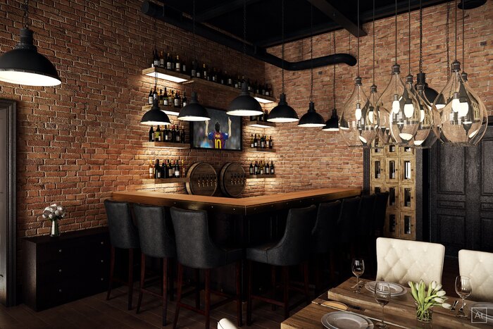 - Необходимо выделить мягкую зону и барную стойку, разместить TV и проектор
