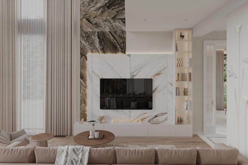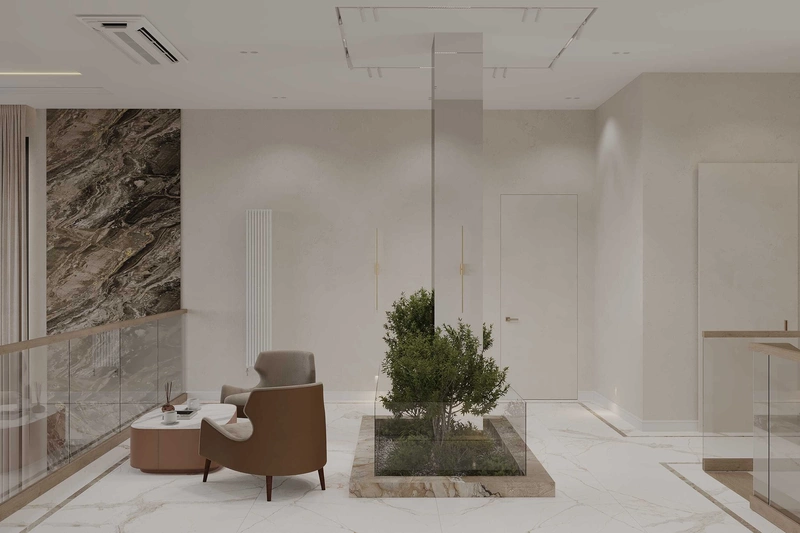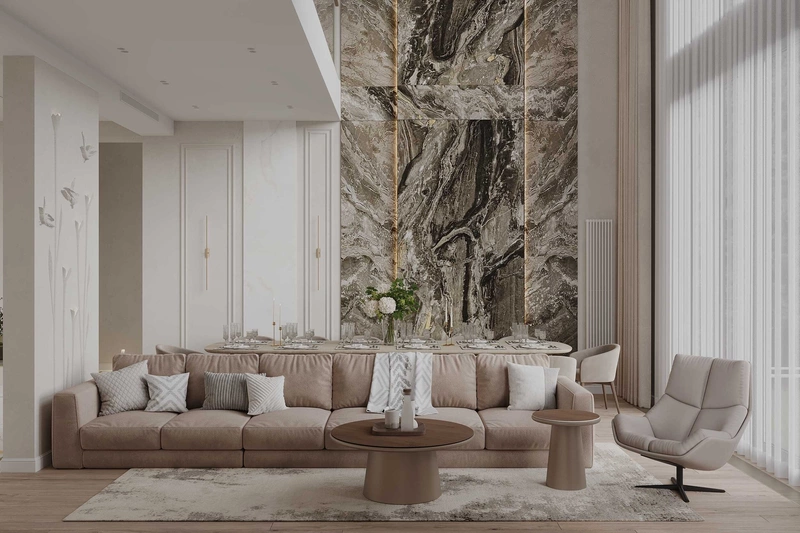 Интерьер выполнен в тёплой цветовой гамме с акцентами на темно-коричневый, что добавляет уют и создаёт гармонию. Использование качественных материалов, таких как керамогранит, камень и гипсовые барельефы, подчеркивает современный стиль, создавая атмосферу, которая радует глаз.