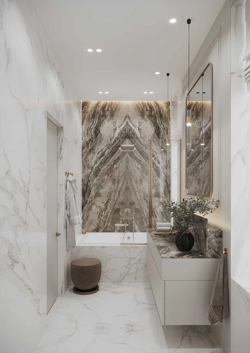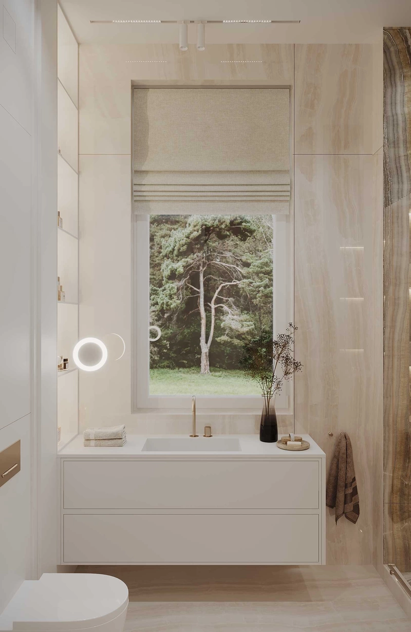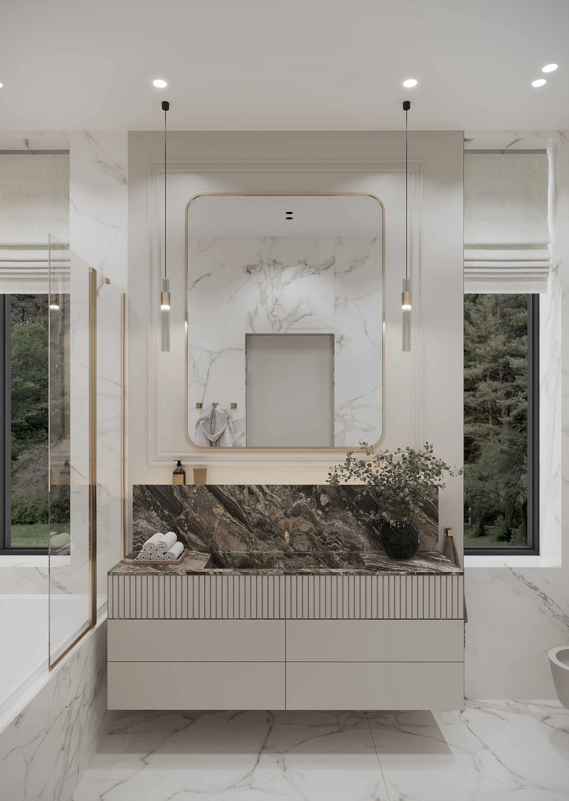 Мебель в ванной минималистична, но продумана до мелочей: широкий столешница из мрамора с встроенной раковиной, под ней удобные ящики для хранения. Всё располагается так, чтобы ванная оставалась аккуратной и удобной для использования каждый день.