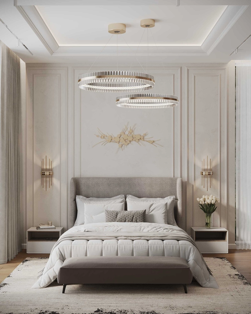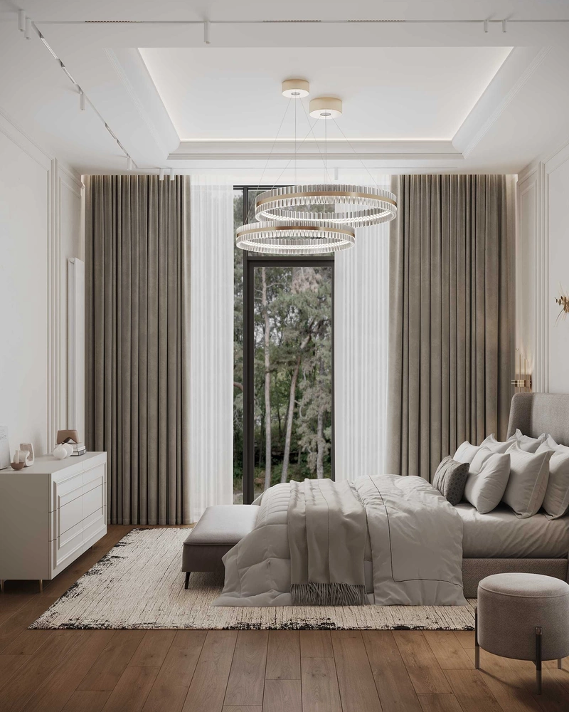 Стены отделаны декоративной штукатуркой, которая добавляет текстуру и тепло. Тёплый оттенок пола и лаконичное изголовье кровати создают гармонию. Банкетка у изножья кровати добавляет функциональность, создавая место для отдыха.