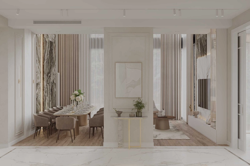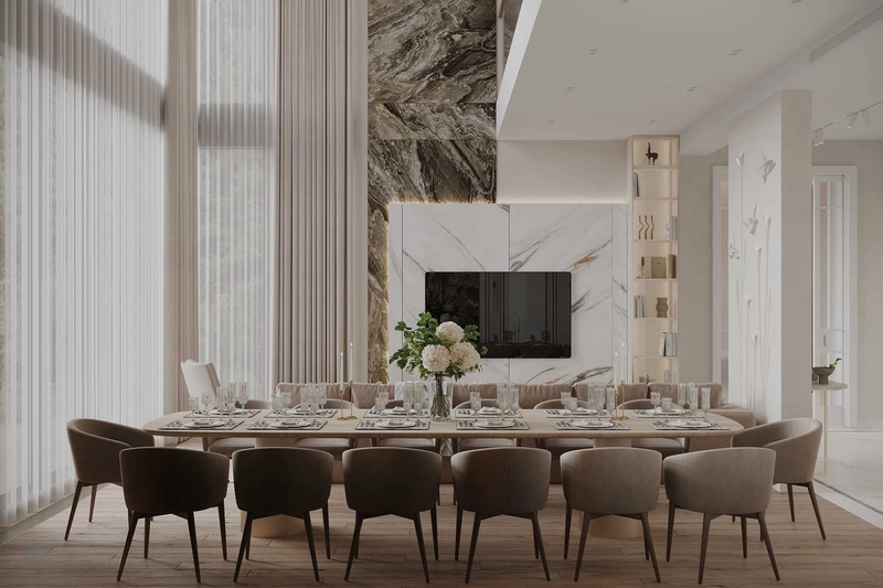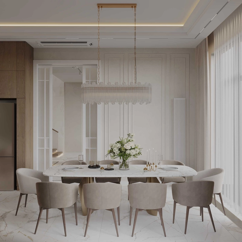 Обеденную зону мы расположили за диванной группой. Большой стол рассчитан на 14 персон — за ним можно собраться всей семьёй, устроить праздничный ужин или принять гостей без компромиссов по посадке и проходам. Такое расположение позволяет обеденной зоне быть частью гостиной, но при этом не мешать зоне отдыха.