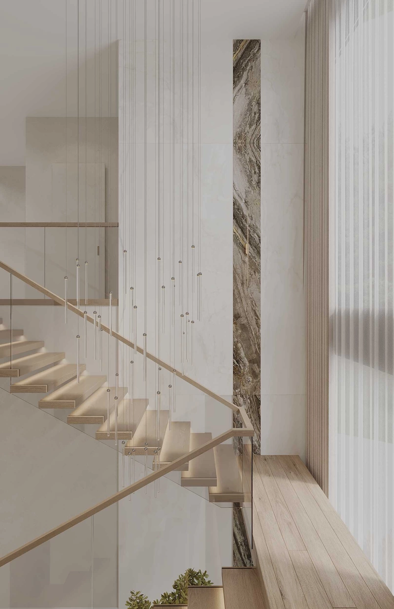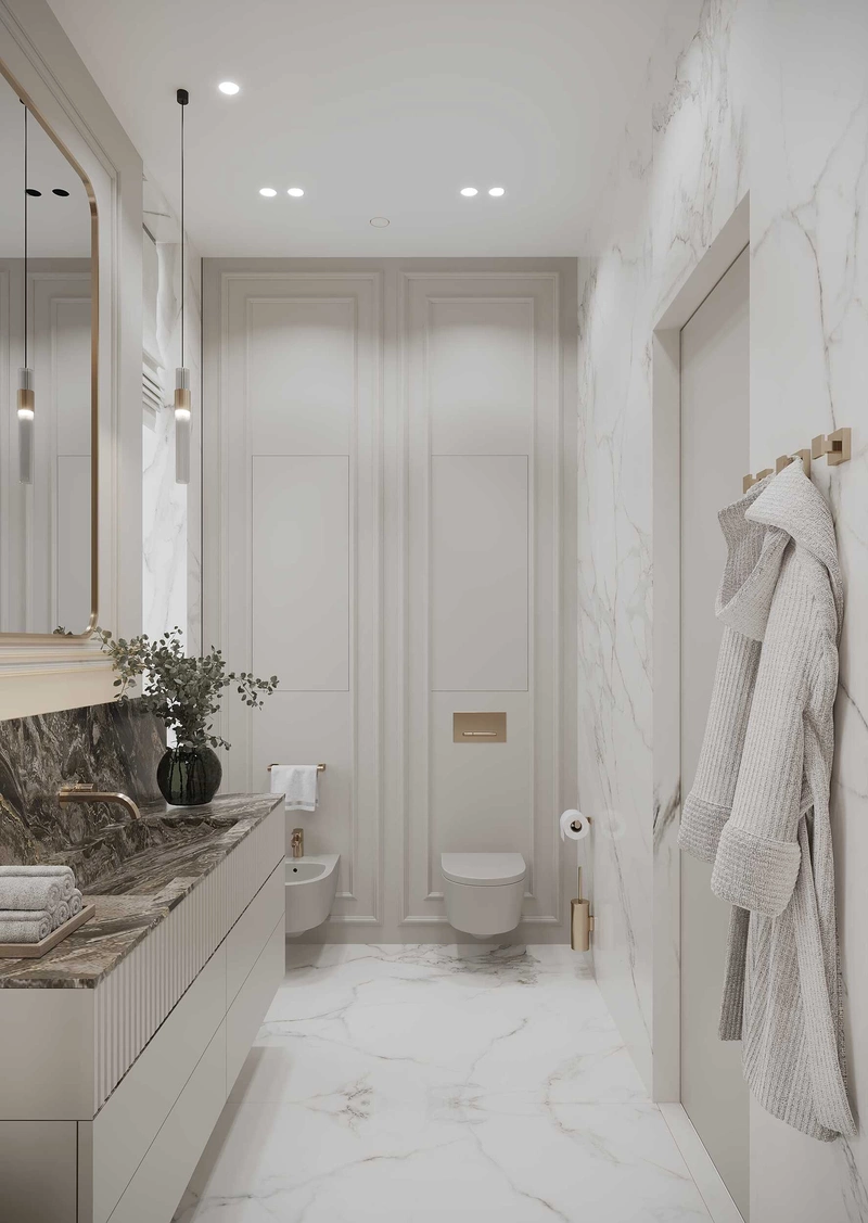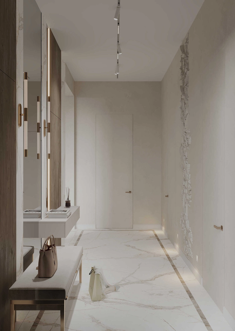 Рядом стоит скамья, которая облегчает процесс переобувания и оставление вещей. Мраморные панели на стенах и встроенные светильники создают гармоничную атмосферу, не утяжеляя пространство. Подсветка добавляет уюта, подчеркивая детали интерьера.