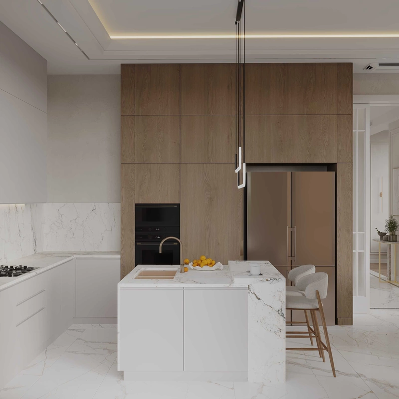 Основная линия кухни собрана в высоких шкафах: техника, хранение и рабочие зоны выстроены в одну ровную композицию. За счёт этого кухня выглядит аккуратно и спокойно, без визуального шума. В эту же линию встроен скрытый проход в техническую кухню — снаружи он воспринимается как часть фасадов, и ничего не отвлекает внимание.