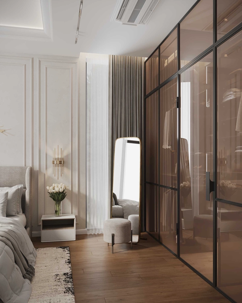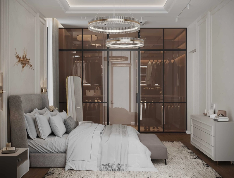 Мастер-гардероб рядом со спальней спроектирован так, чтобы максимально эффективно использовать пространство для хранения. Мы сделали гардеробную за стеклянной перегородкой с бронзовыми стеклами, почти коричневыми, чтобы избежать полупрозрачного эффекта и не потерять объём комнаты. Это решение добавляет легкости, сохраняет при этом функциональность и порядок.